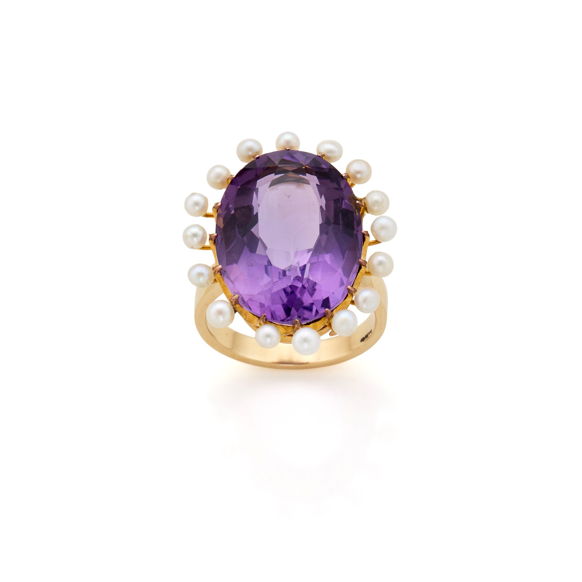 18 Kt and 9 Kt yellow gold ring with an oval amethyst of approximately 18 ct with white cultured pearls.