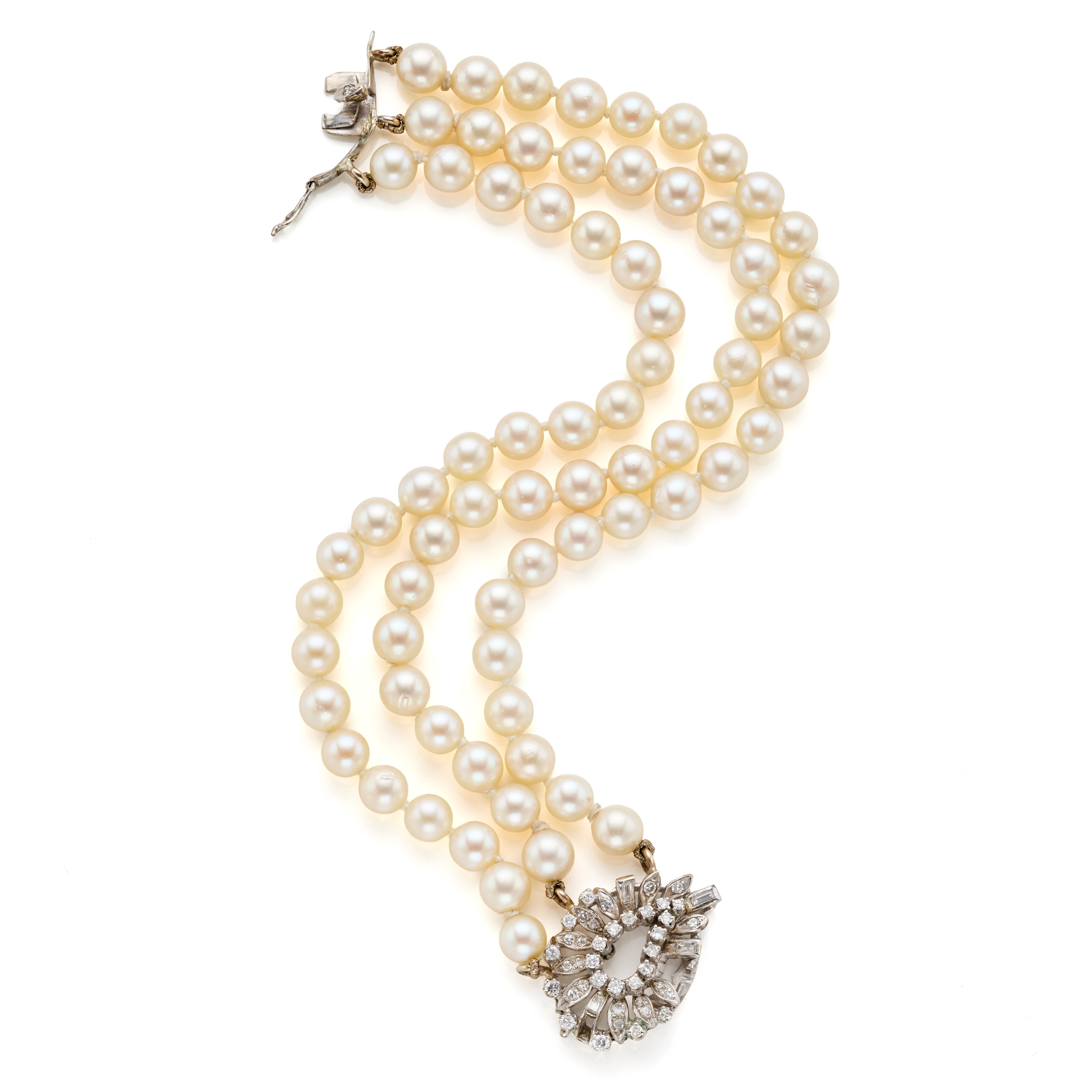 Bracciale a tre fili di perle bianche coltivate di circa 6,5 mm con chiusura in oro bianco 18 Kt rifinita con diamanti rotondi, huit huit e baguette per complessivi circa 0,65 ct.
