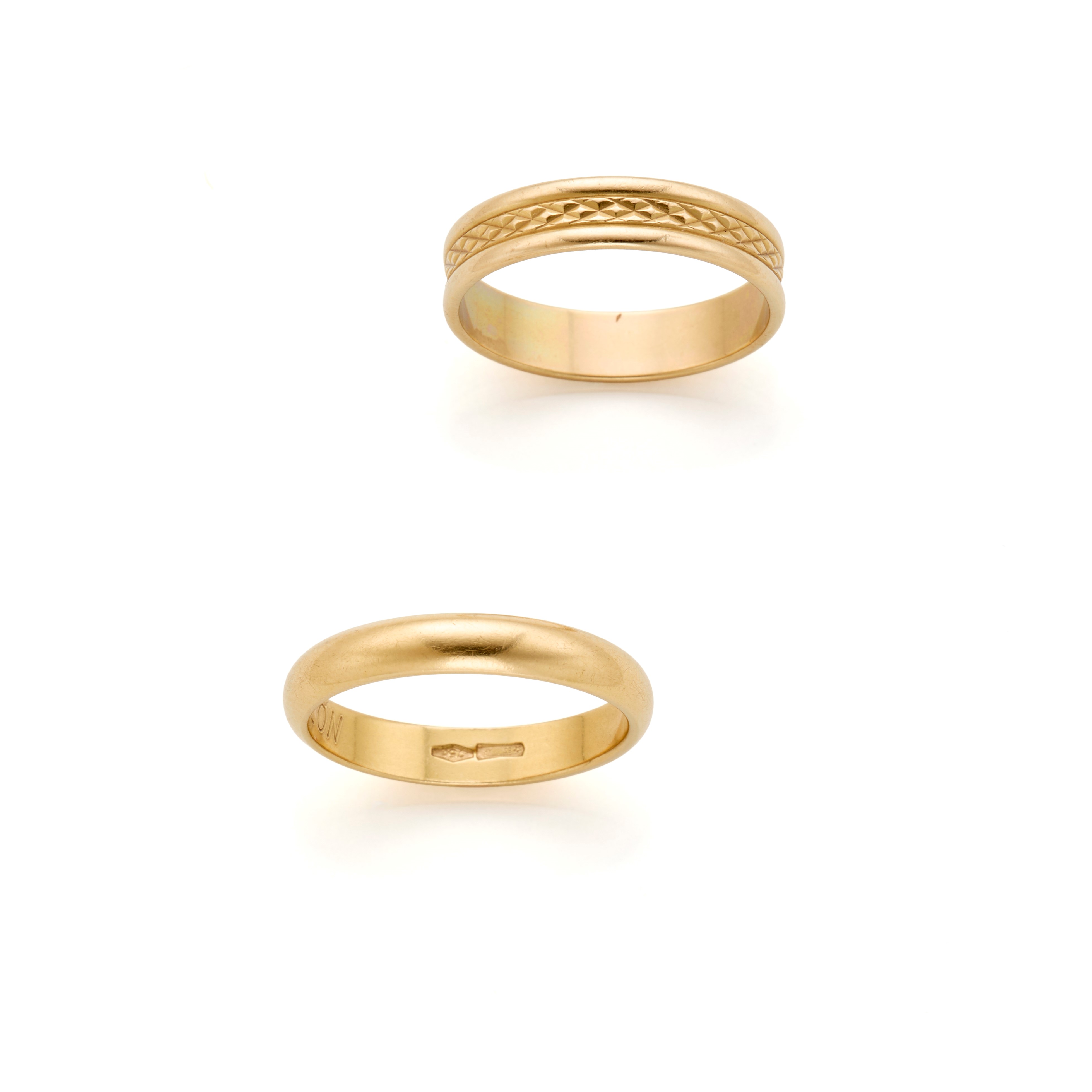 Lotto composto da due fedi in oro giallo 18 Kt di cui una con motivi geometrici.