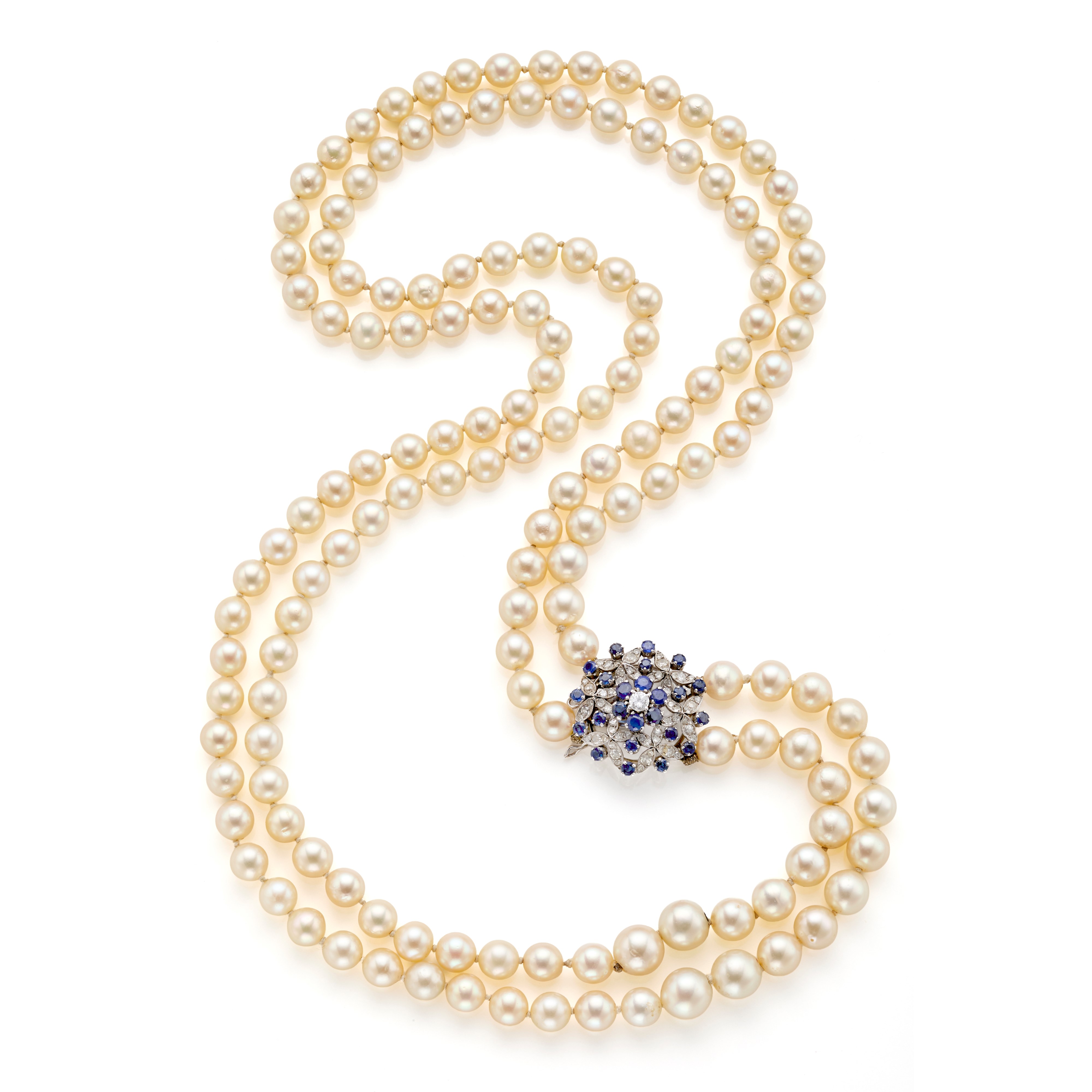 Two strand pearls necklace with gold claps finished with diamonds and sapphires