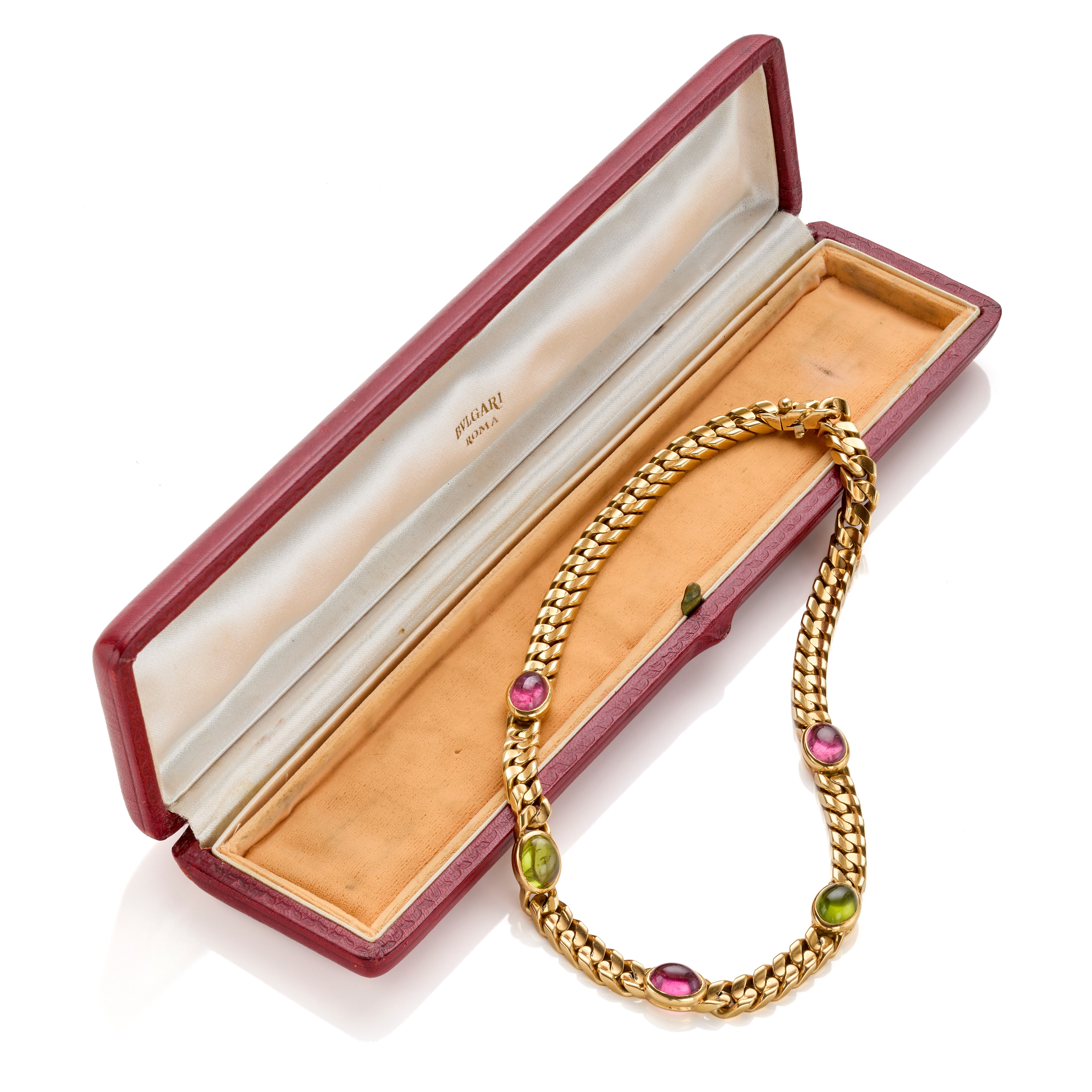 Bulgari 18 Kt gold groumette chain necklace with pink and green cabochon tourmalines totalling approx. 16,45 ct. Within Bulgari box.