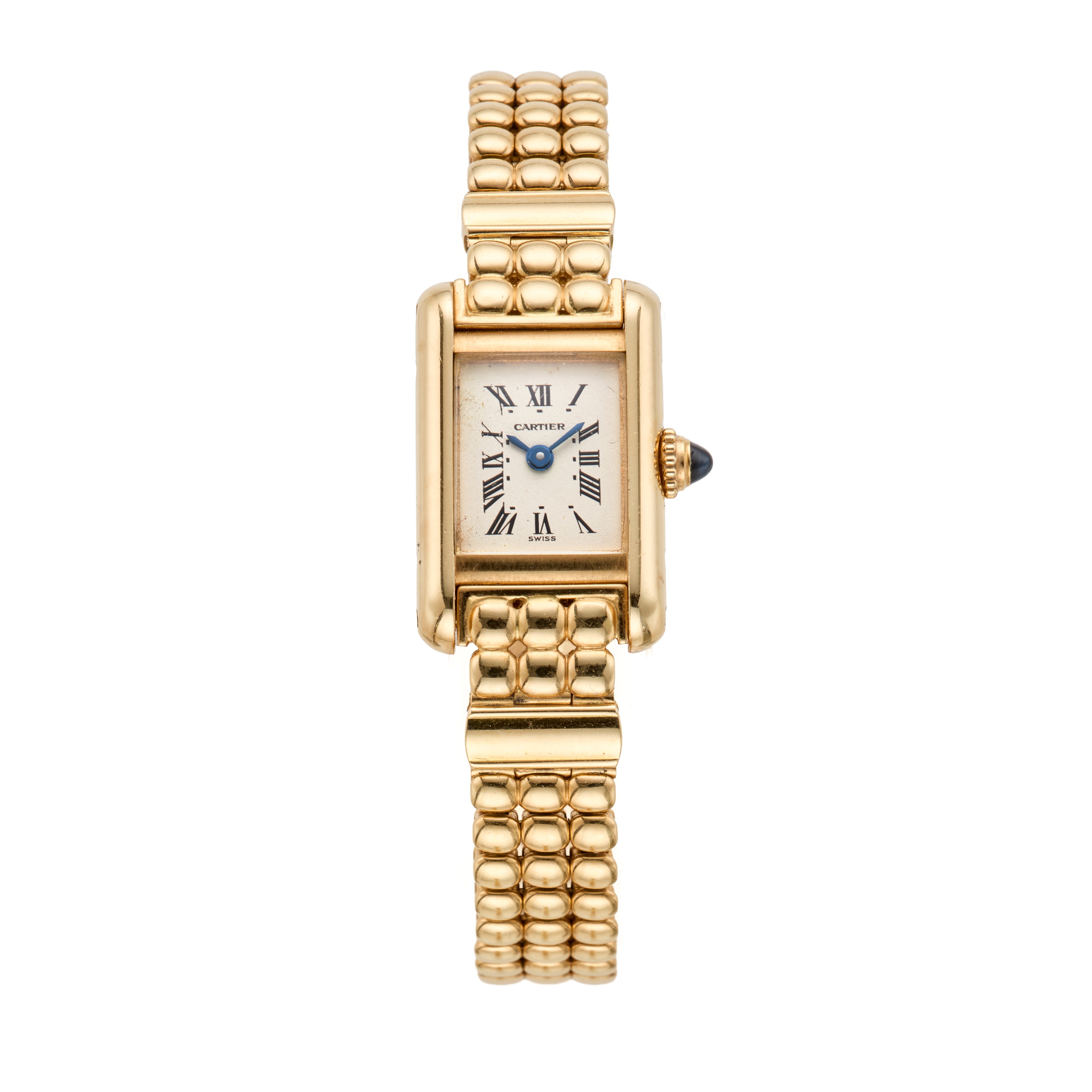 Mini Tank Louis Cartier, ref. 1446, fine anni '80. Cassa e bracciale in oro giallo 18 Kt. Movimento al quarzo con pila da sostituire. Corredato di garanzia. Condizioni molto buone.