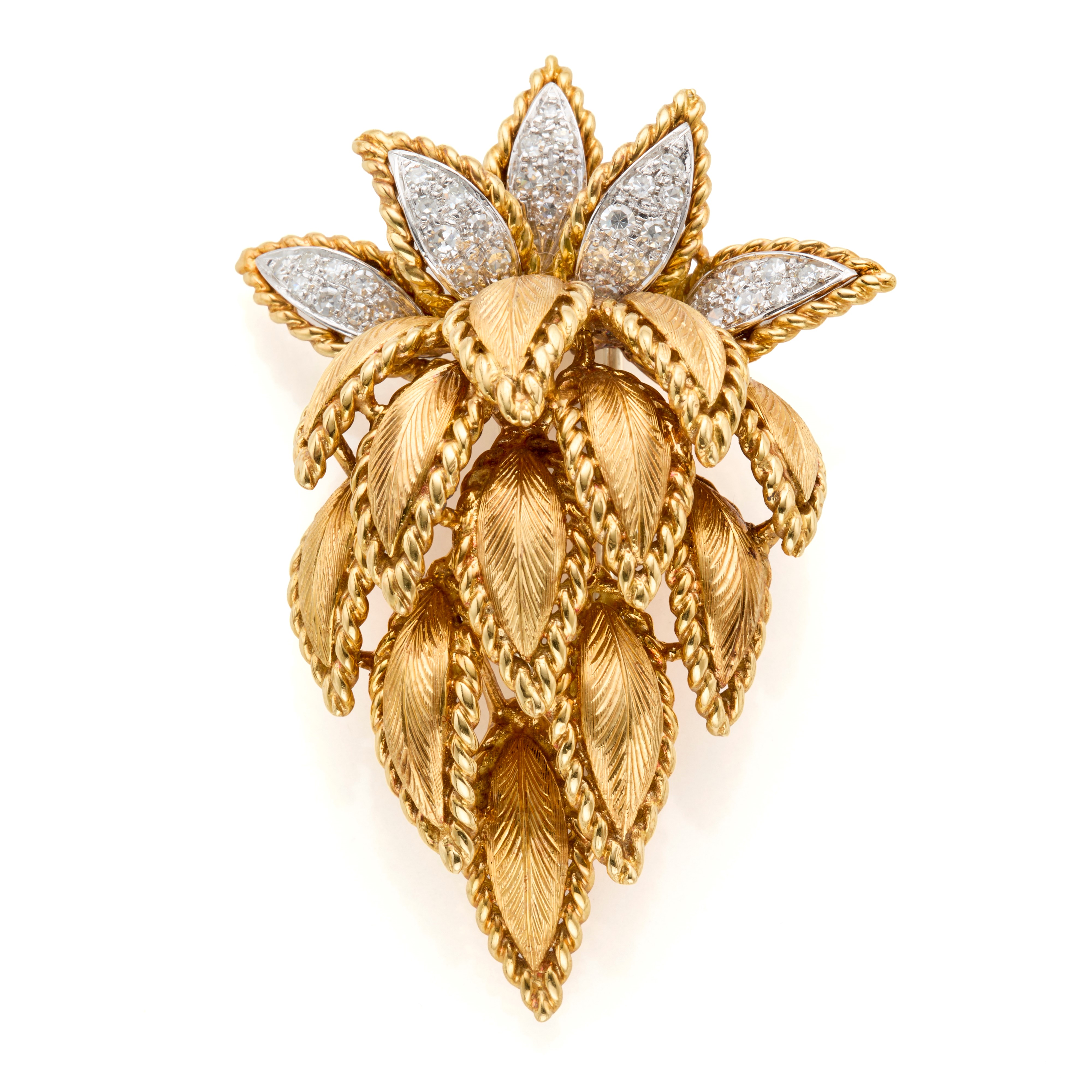 Spilla a foglie in oro giallo e bianco 18 Kt rifinita con diamanti rotondi per complessivi circa 0,60 ct.