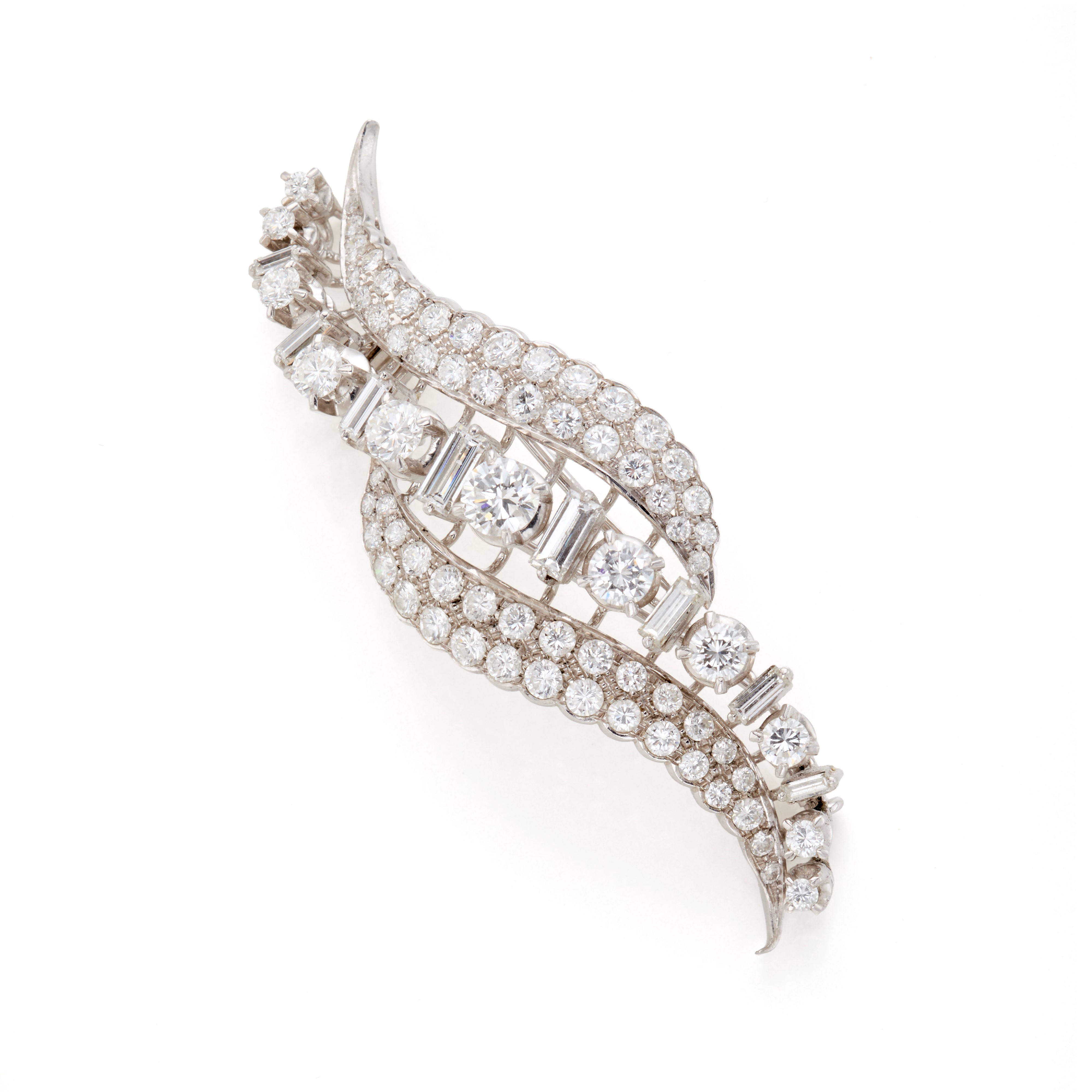 18 Kt white gold brooch with round diamonds totalling approx. 5,70 ct and baguette diamonds weighing approx. 1,30 ct overall.