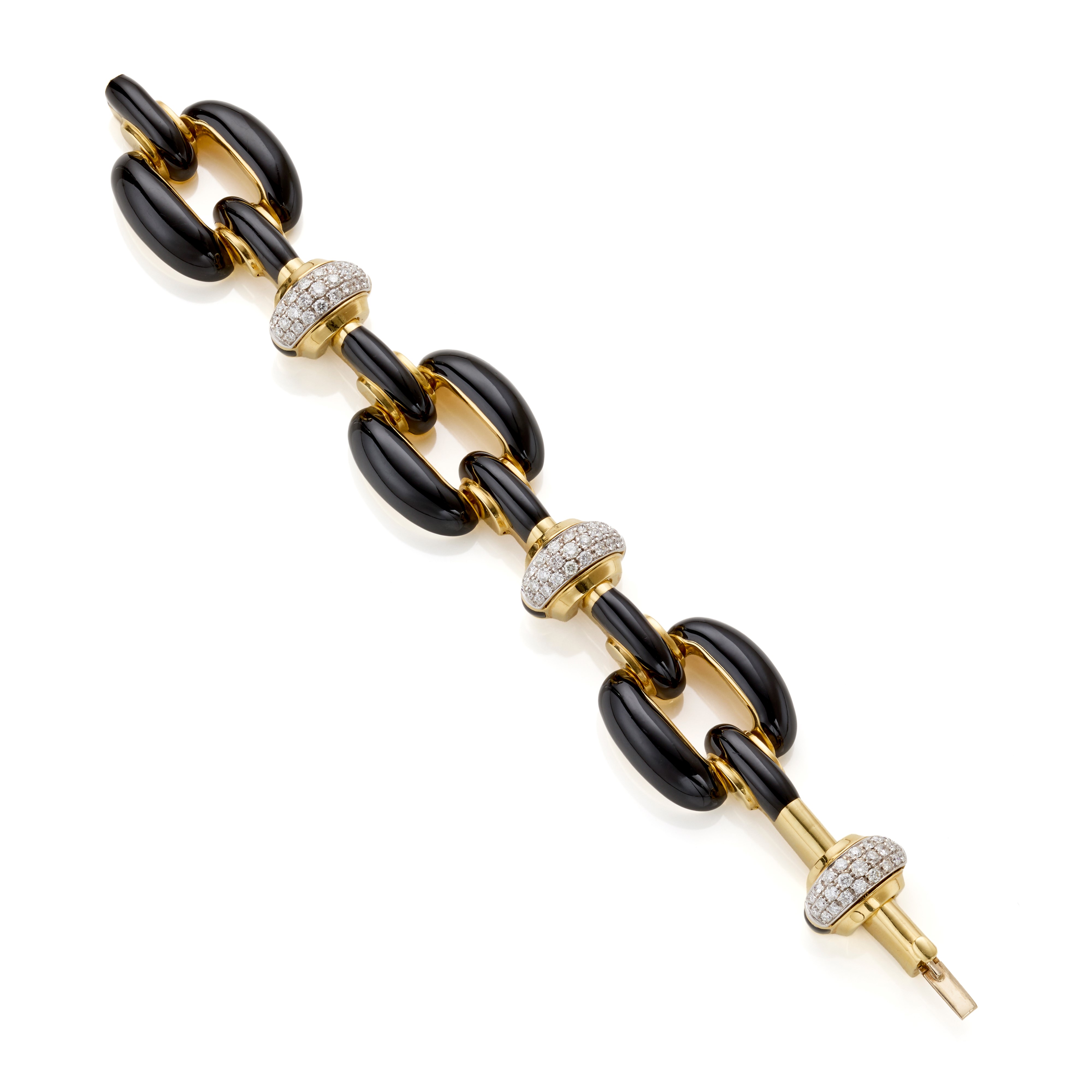 Bracciale modulare in oro giallo e bianco 18 Kt rifinito con smalto nero e diamanti per complessivi circa 2,50 ct