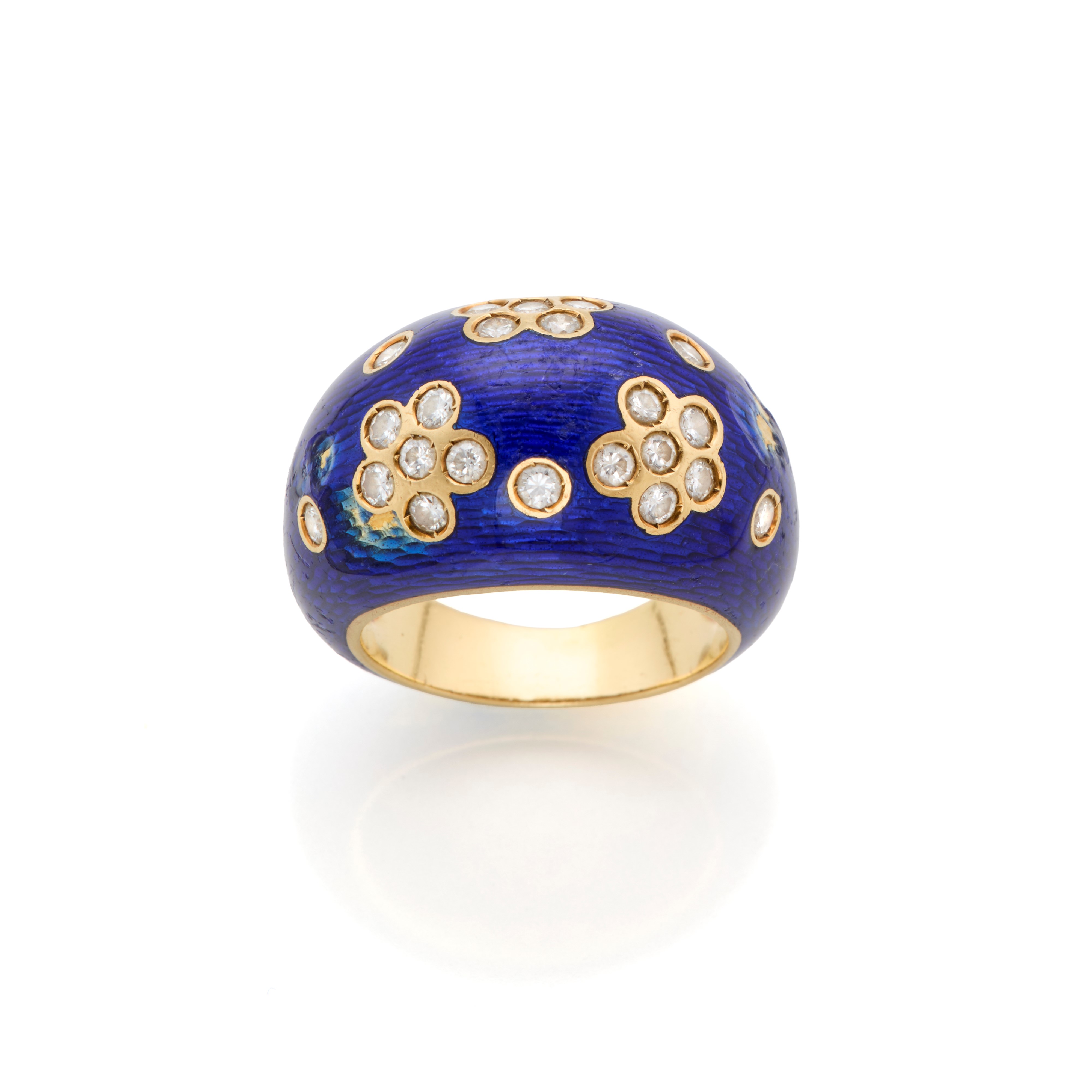 Anello Illario in oro giallo 18 Kt con smalto guilloché rifinito con diamanti rotondi per complessivi circa 0,85 ct.