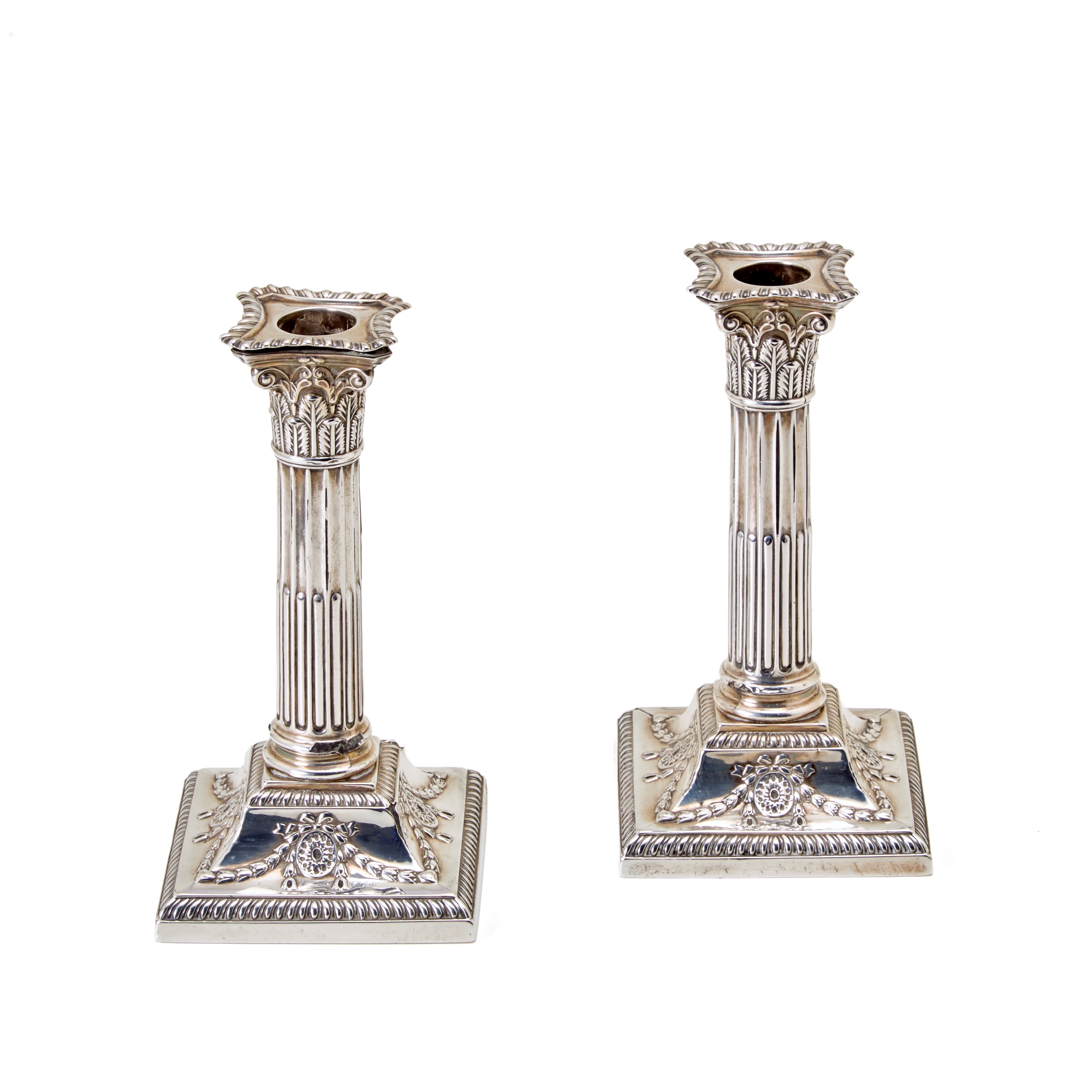 Coppia di candelieri in argento con fusto a colonna terminato con capitello corinzio. Punzoni inglesi.