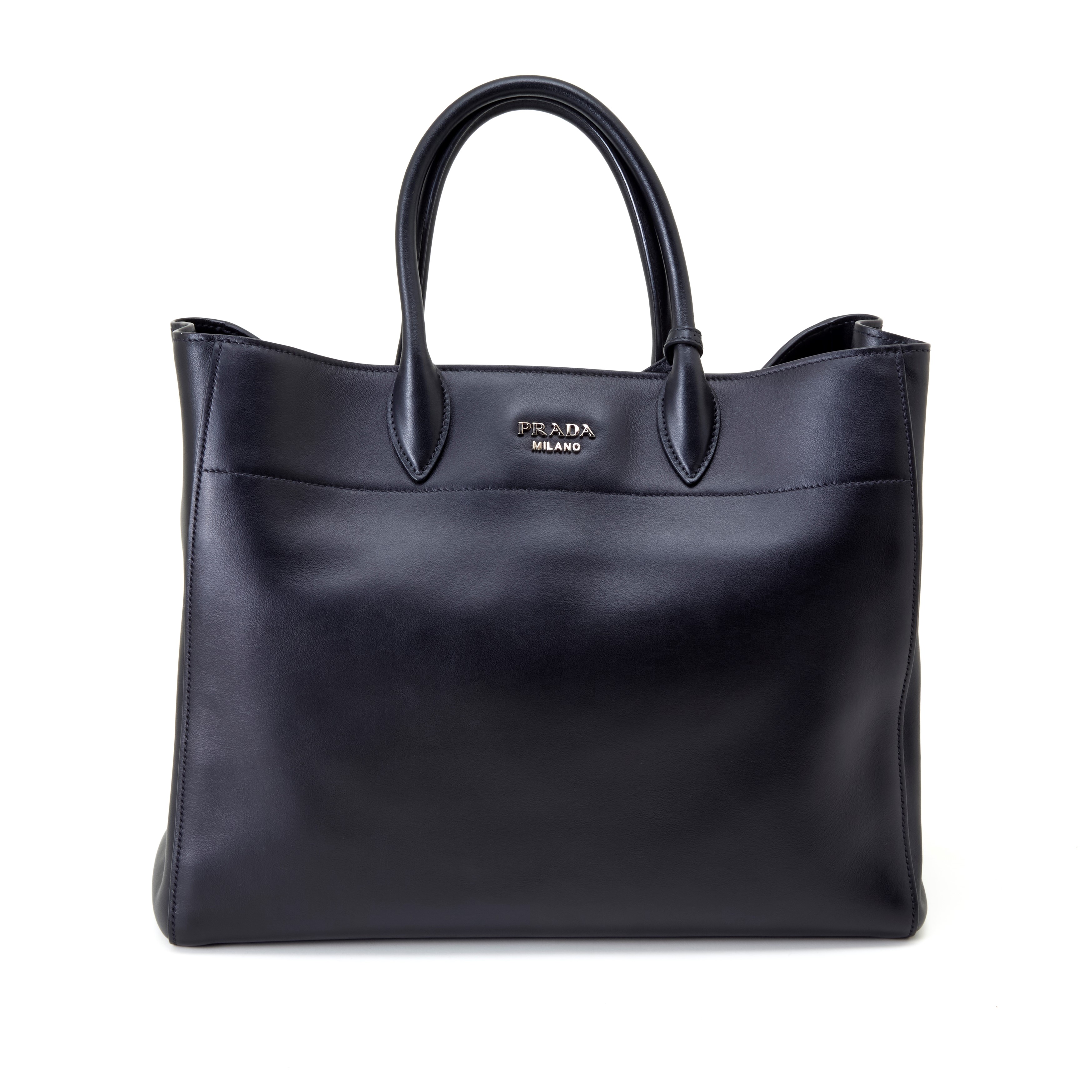 Borsa da lavoro Prada in pelle City Calf nera con metalleria argentata. Doppio scompartimento interno. Tracolla amovibile in pelle con borchie argentate e portachiavi amovibile. Completa di carta di autenticità e dustbag originali. Come nuova.