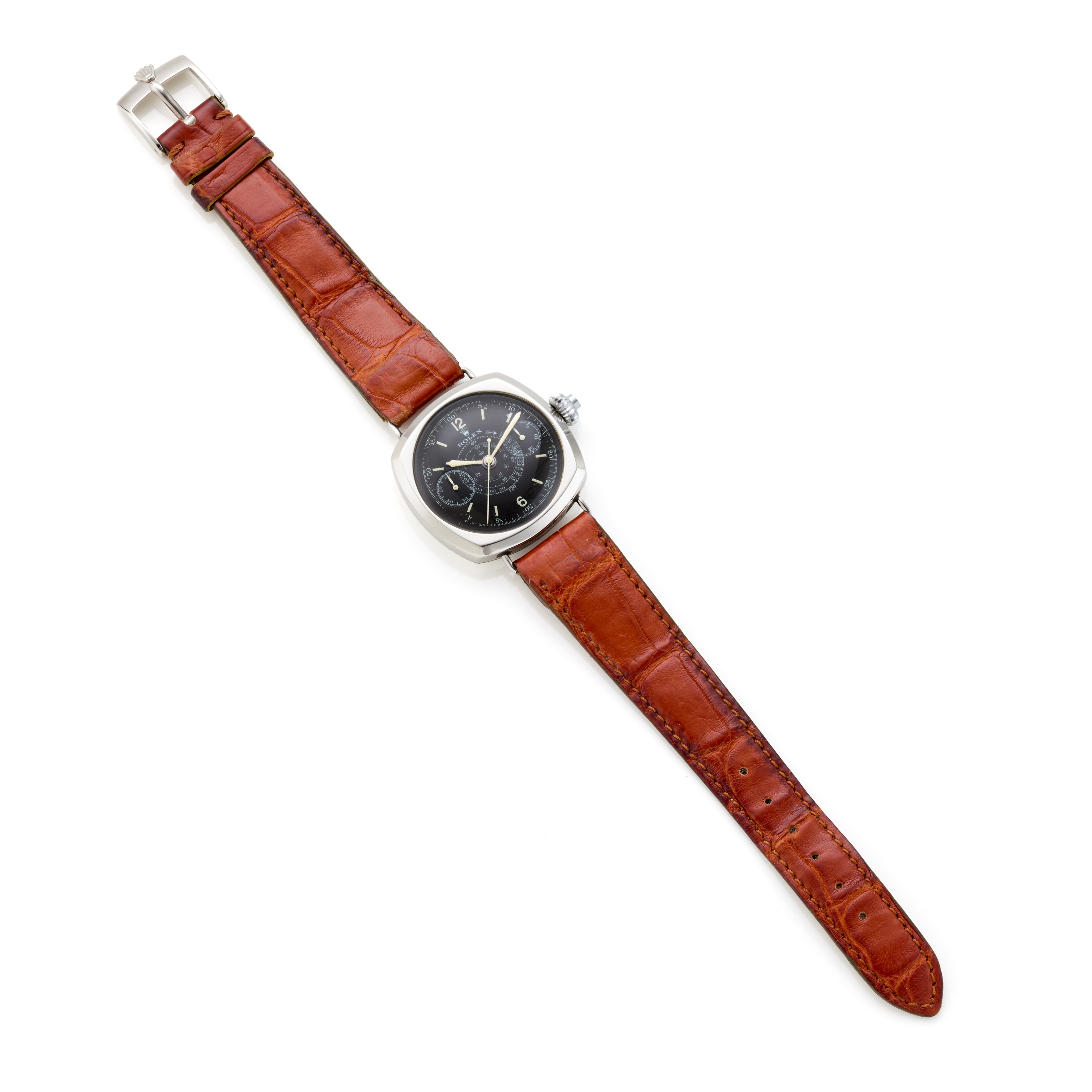 Rolex Chronograph monopulsante 1215, anni ‘40/50. Cassa a cuscino in acciaio, quadrante nero con scala tachimetrica e due contatori. Cinturino in pelle e fibbia originale ad ardiglione in acciaio. Movimento meccanico a carica manuale. Condizioni molto buone.