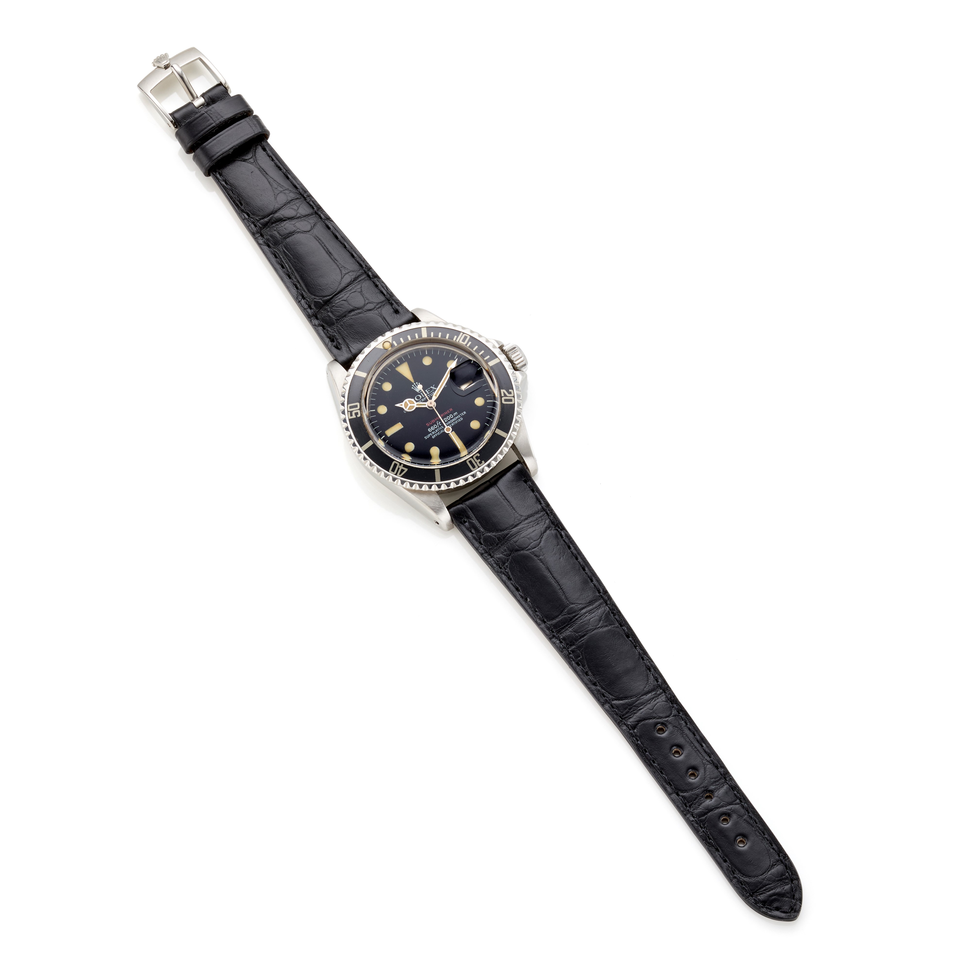 Rolex Submariner Date, ref. 1680, anni '70. Cassa in acciaio, quadrante nero, vetroplastica con lente Cyclope per la data. Cinturino in pelle e fibbia originale ad ardiglione in acciao. Movimento meccanico a carica automatica. Buone condizioni. Corredato di scatola originale.