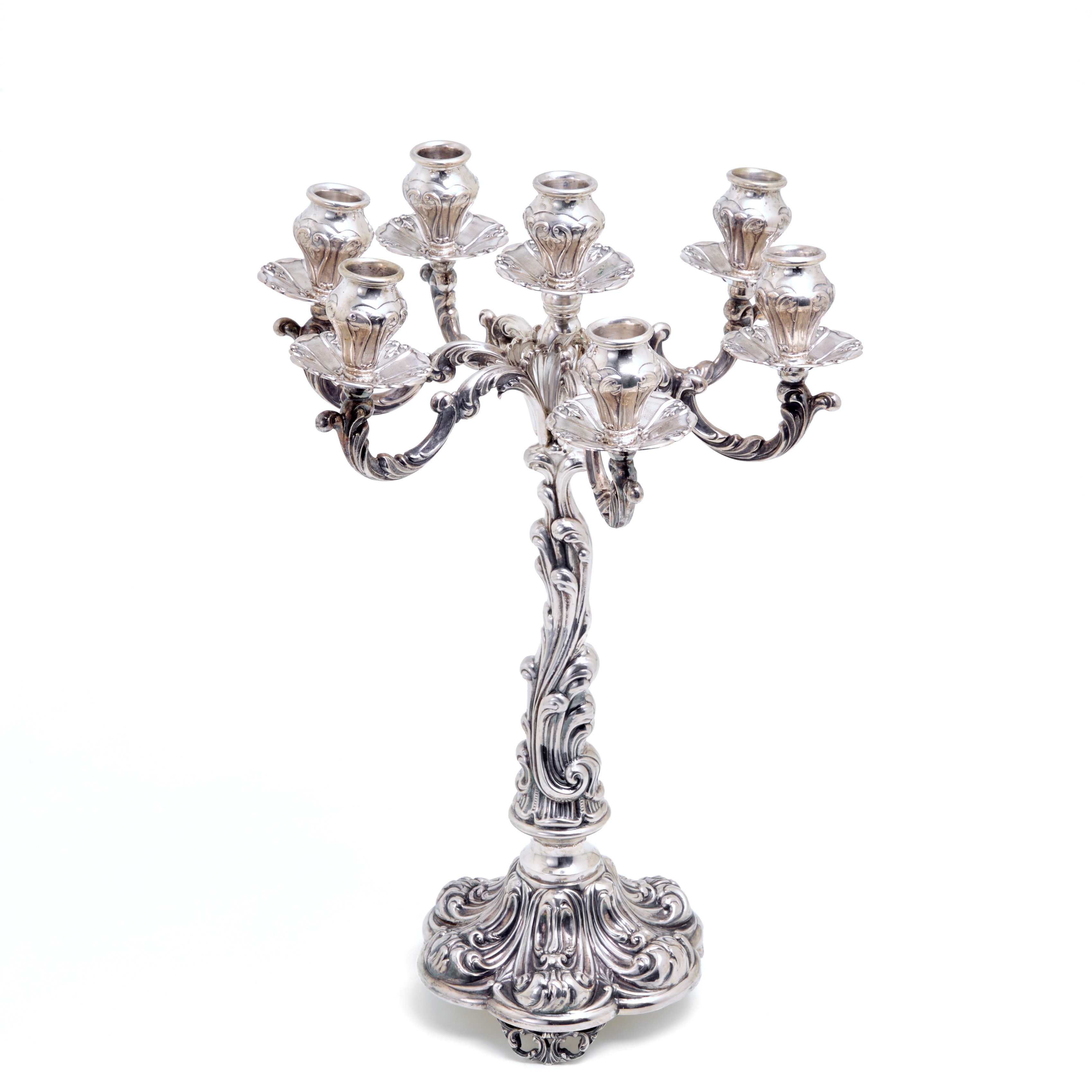 Candelabro a sei fiamme in argento con bracci e fusto decorati a volute fogliate.