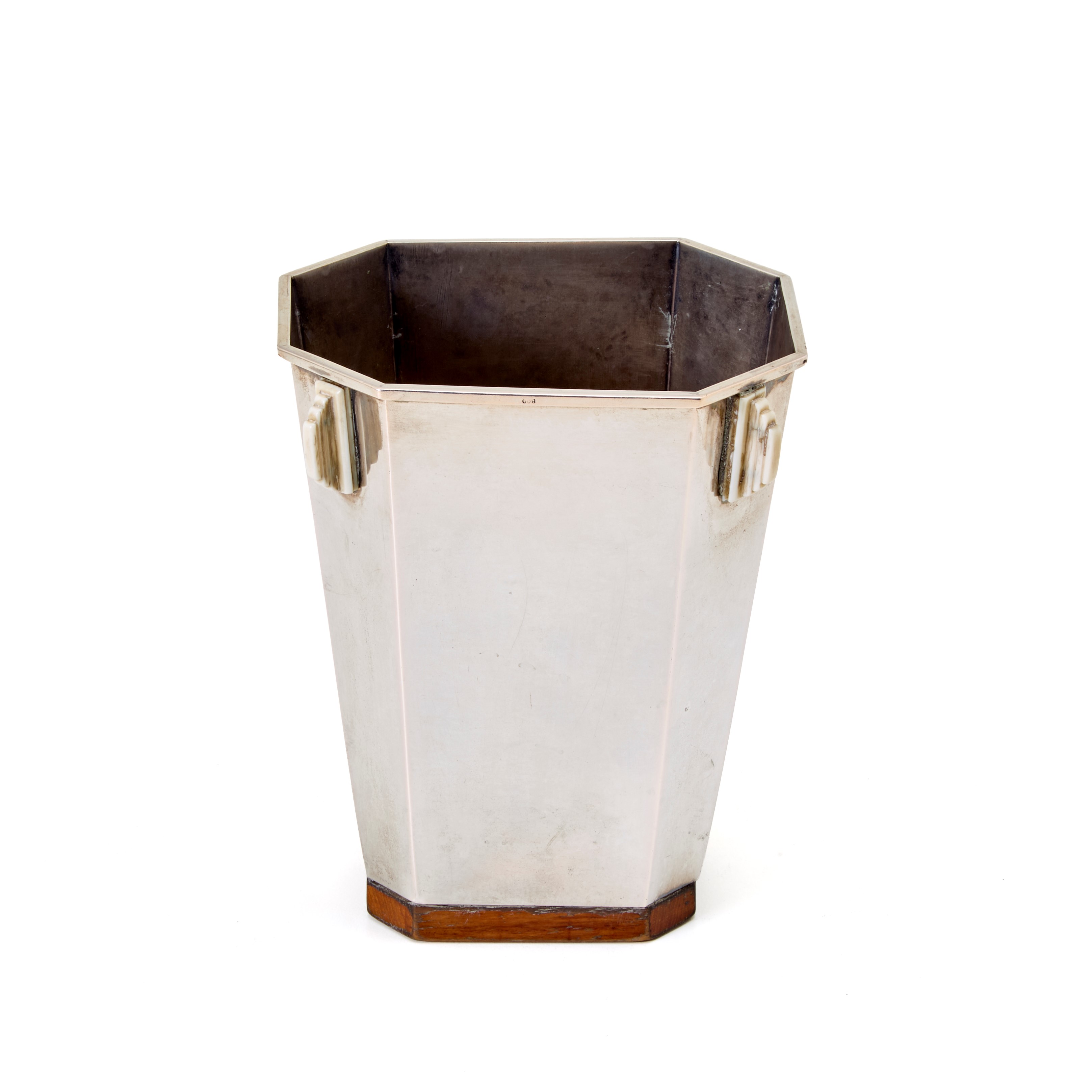 Vaso ottagonale in argento con base in legno e decori in materiale organico.