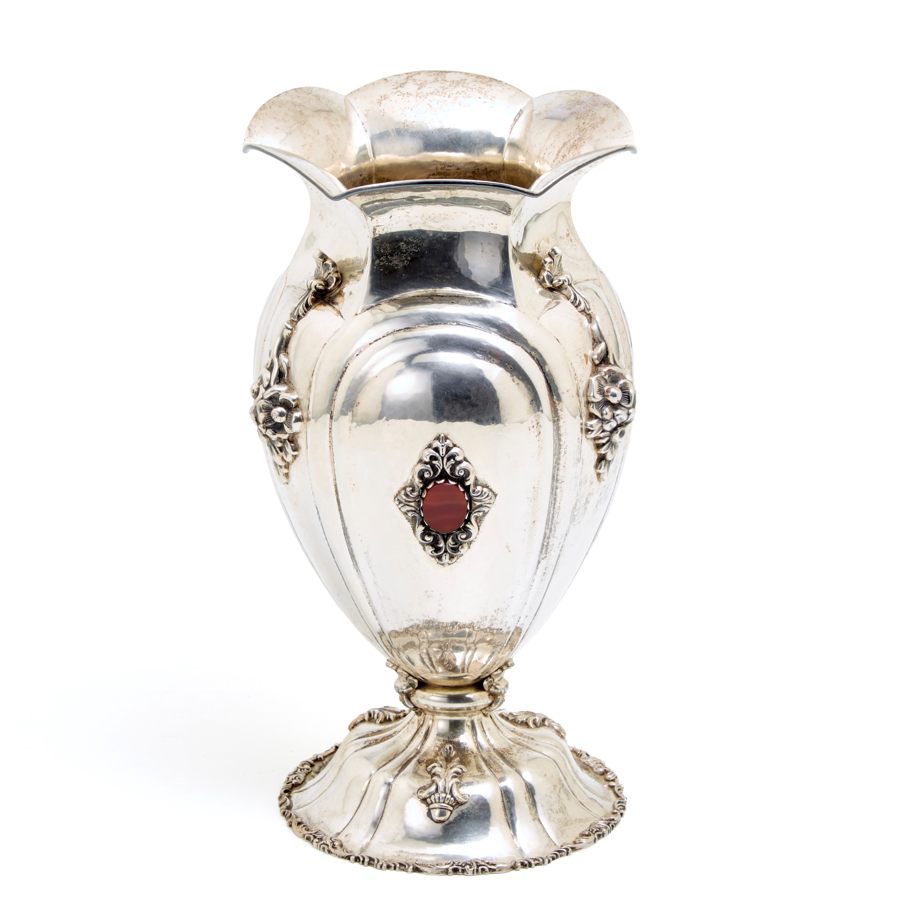 Vaso in argento decorato a motivi floreali e corniole ovali.