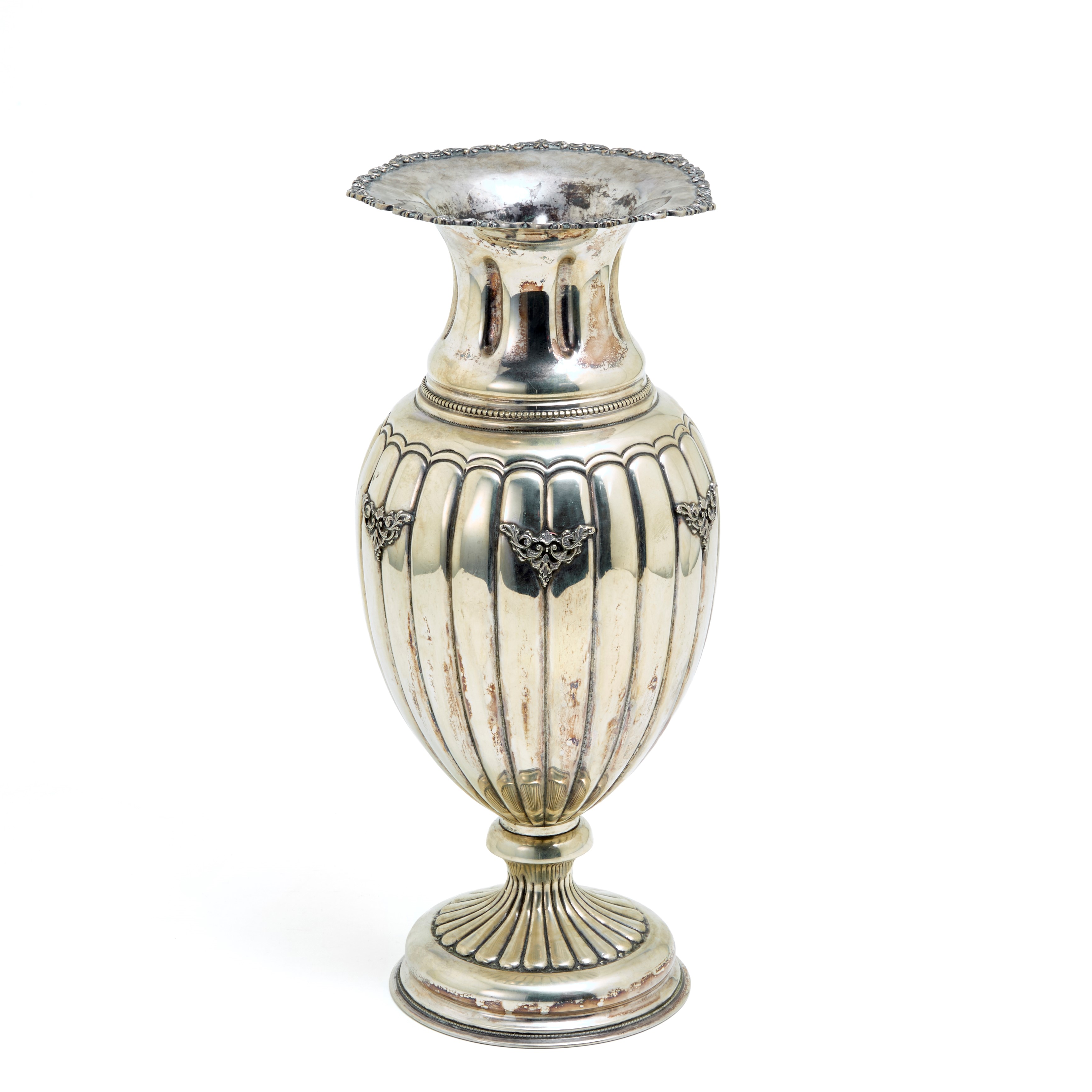 Vaso in argento con corpo costolonato decorato con motivi vegetali a volute.
