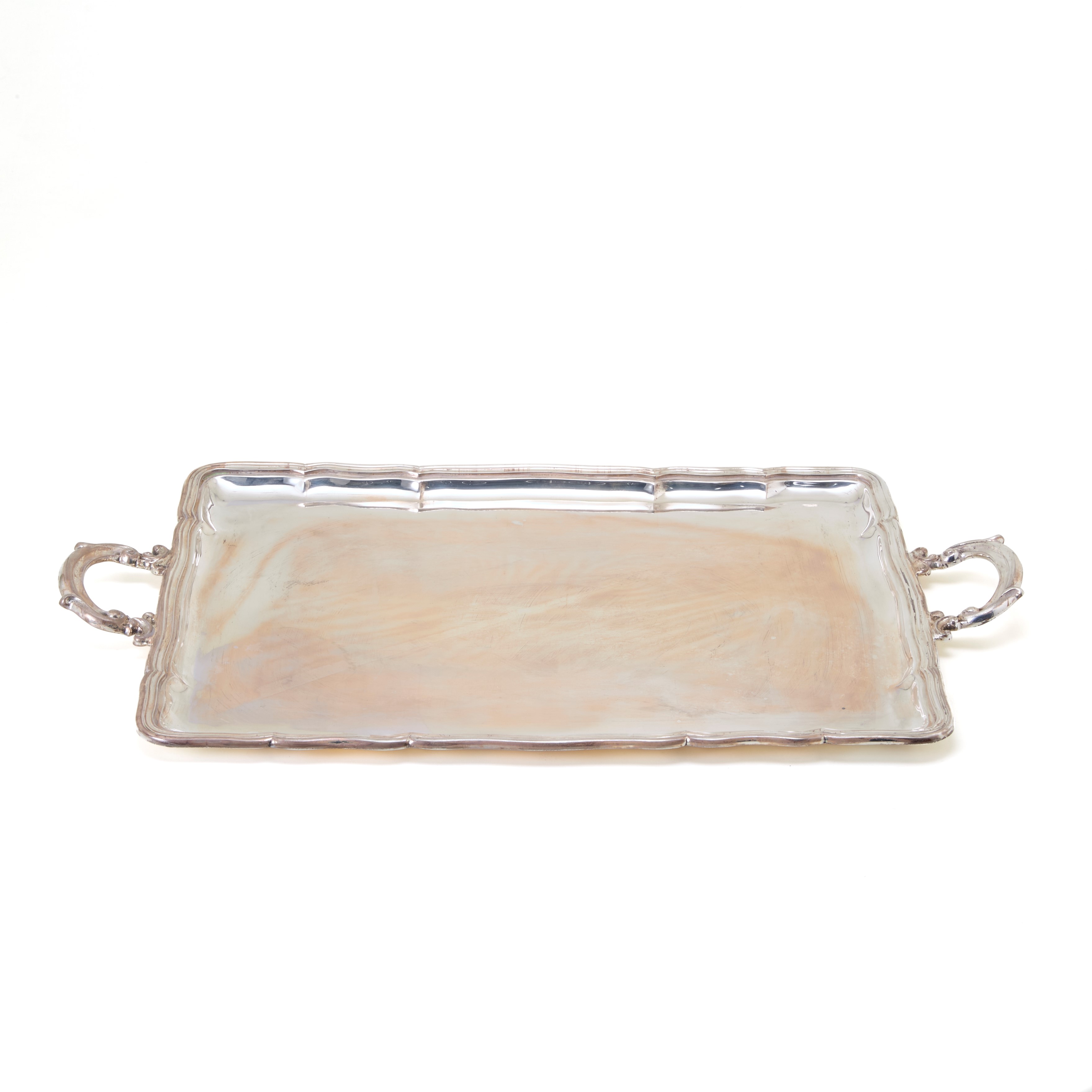 Vassoio biansato di forma rettangolare in argento a corpo liscio con bordo mistilineo e anse a volute.