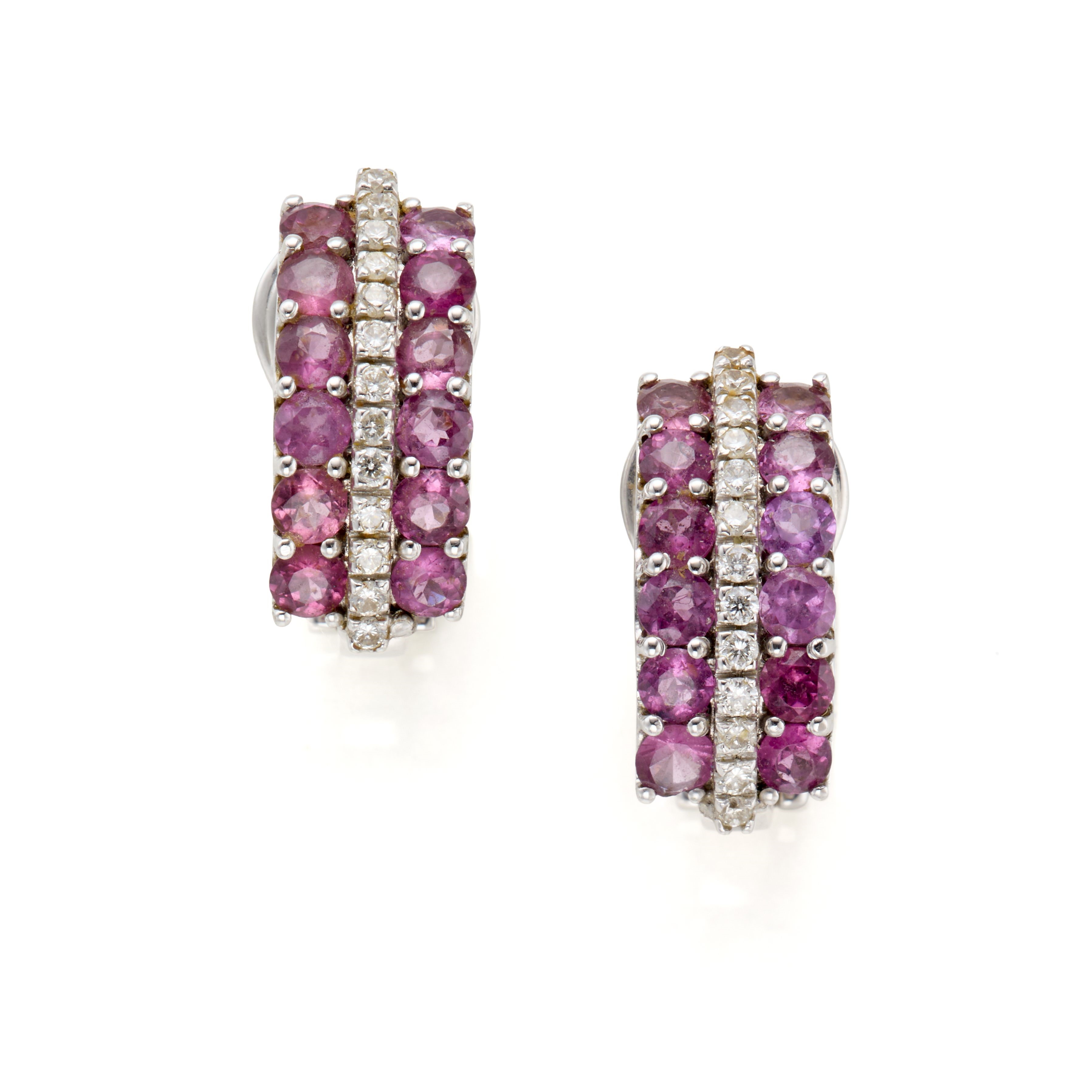 Orecchini a clip in oro bianco 18 Kt con diamanti rotondi per complessivi circa 0,25 ct e gemme rosa.