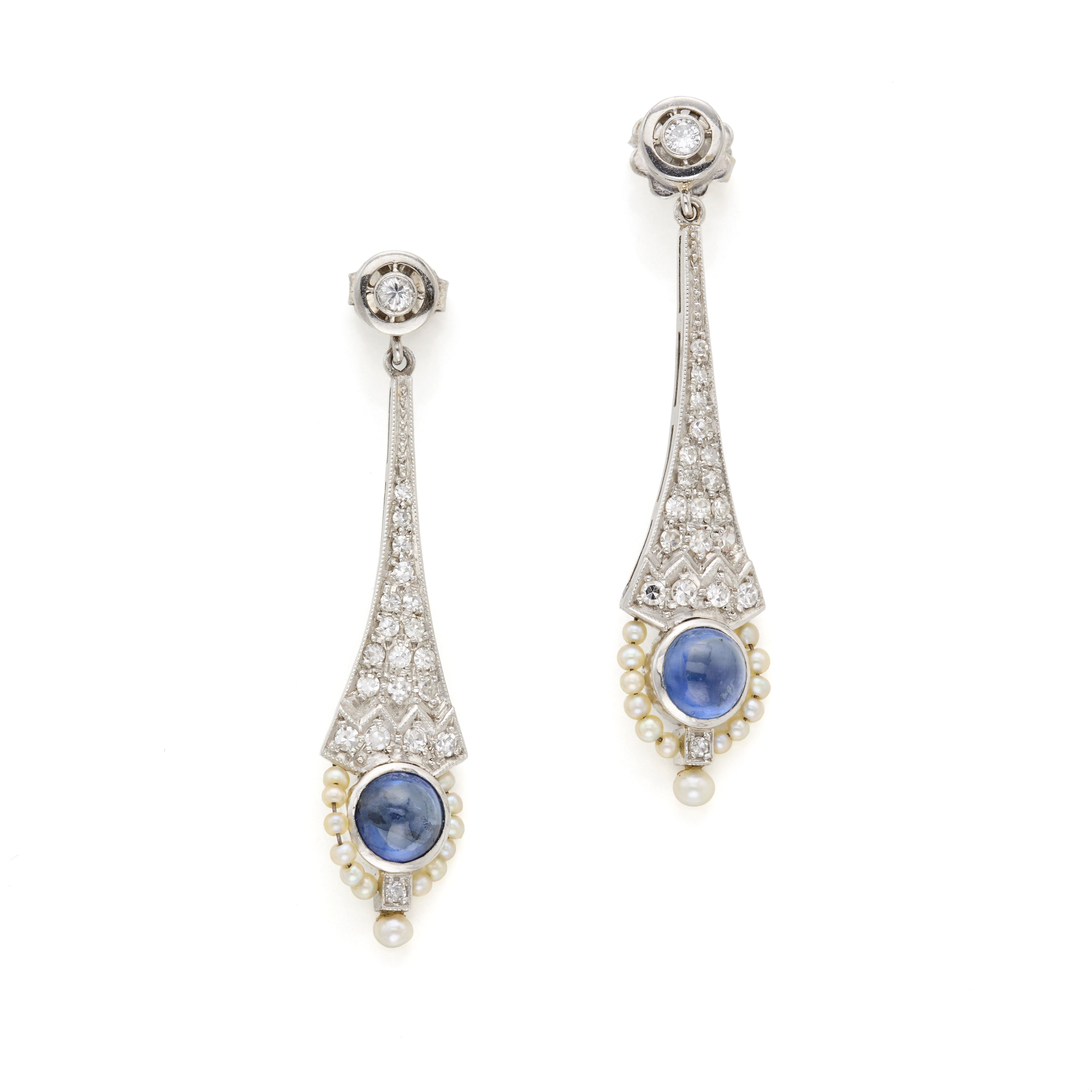 Orecchini pendenti in oro bianco 18 Kt con diamanti huit huit per complessivi circa 0,30 ct terminati con zaffiri rotondi cabochon e microperle.