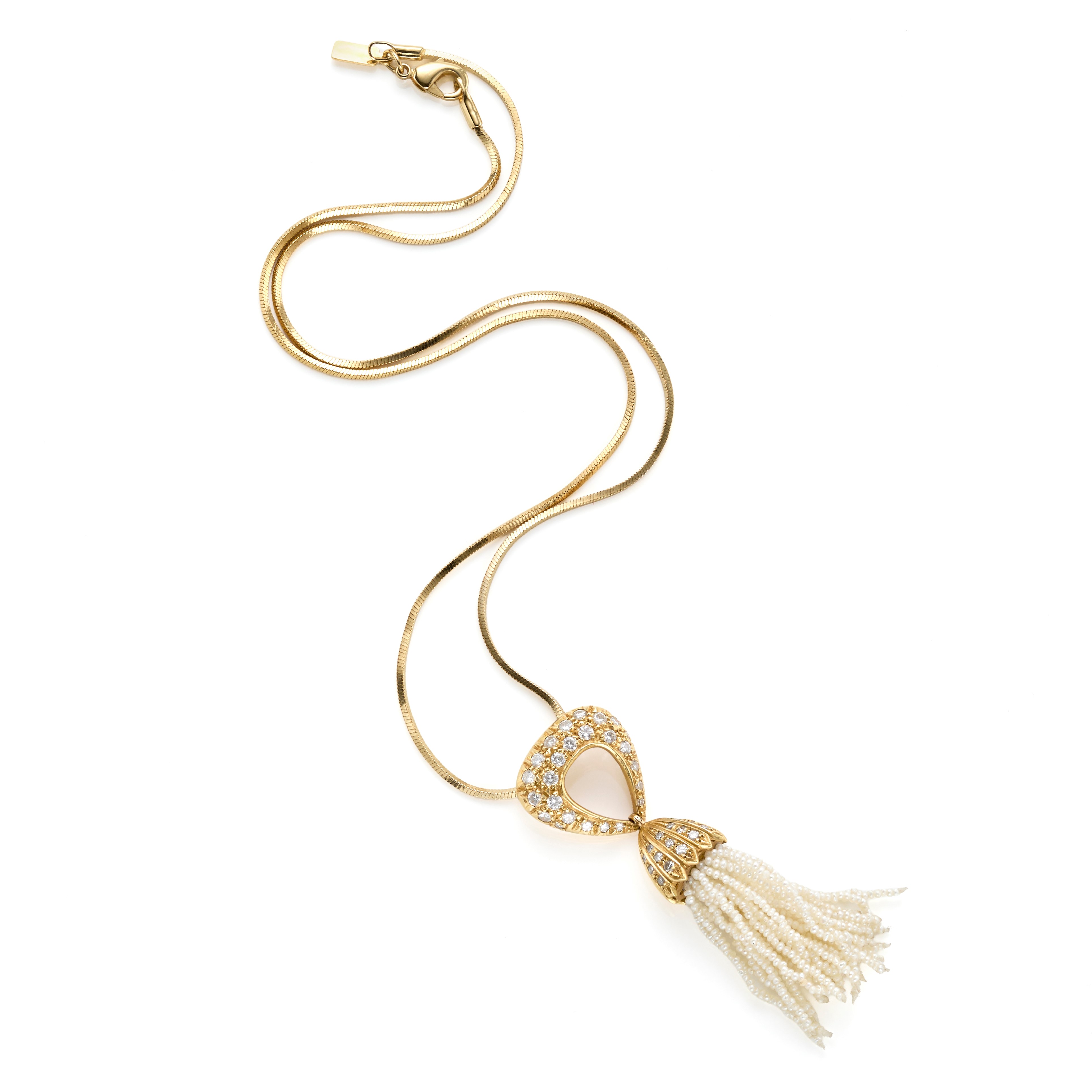 Pendente in oro giallo 18 Kt con nappa in microperle e rifinito con diamanti rotondi per complessivi circa 0,40 ct, con catena in metallo dorato.