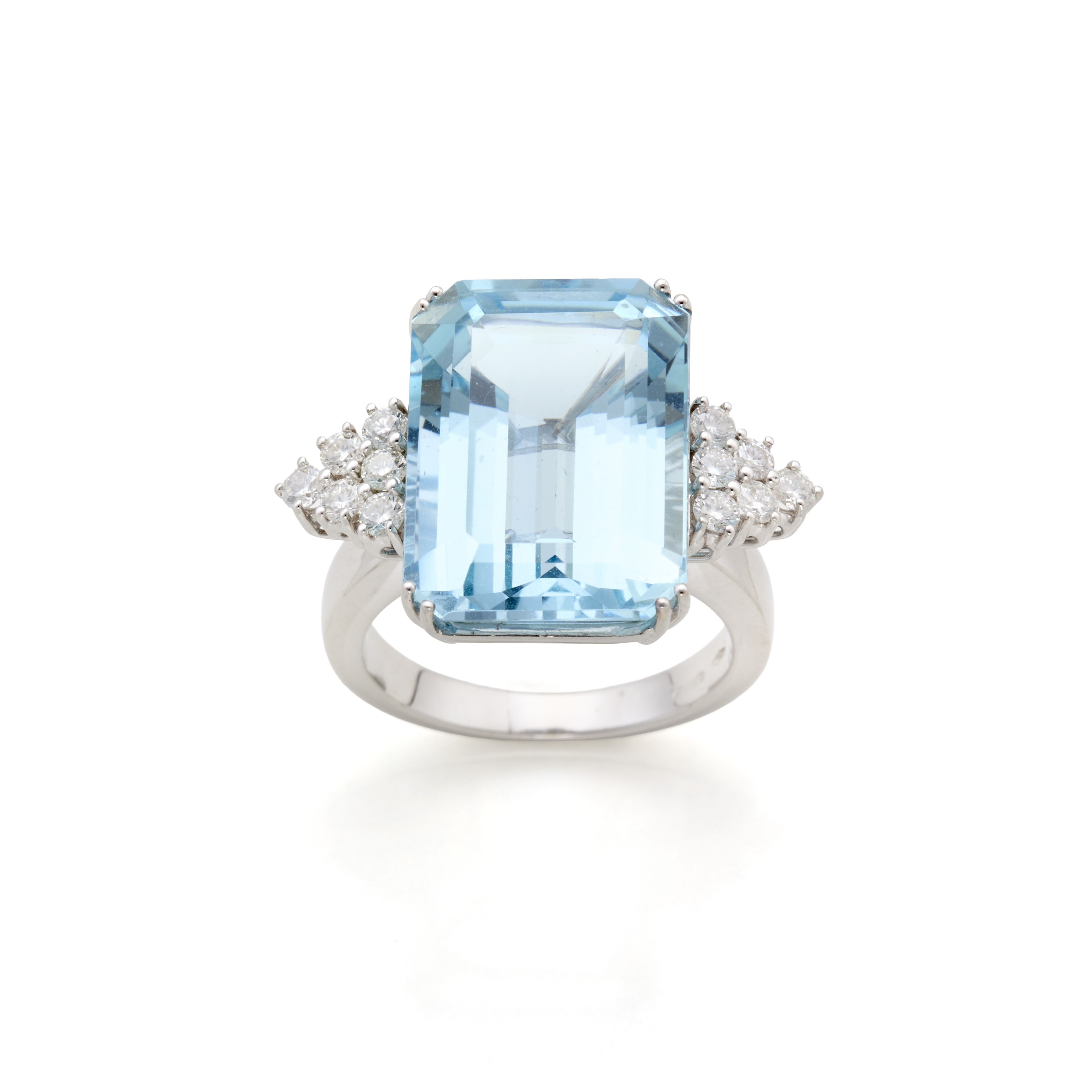 Anello in oro bianco 18 Kt con acquamarina ottagonale di circa 15,35 ct e diamanti rotondi per complessivi circa 0,45 ct.