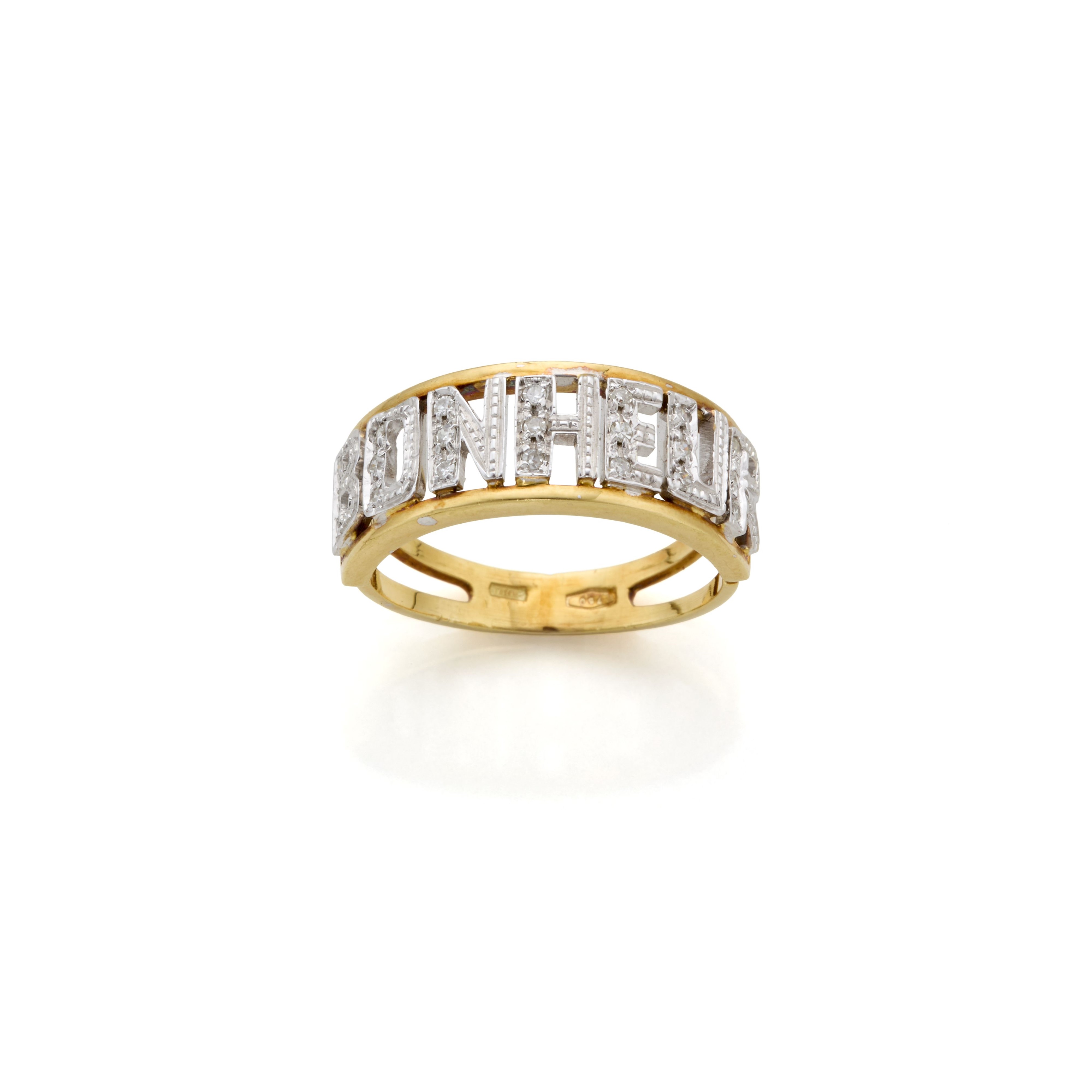 18 Kt yellow and white gold ring with the word "Bonheur" set with round diamonds.