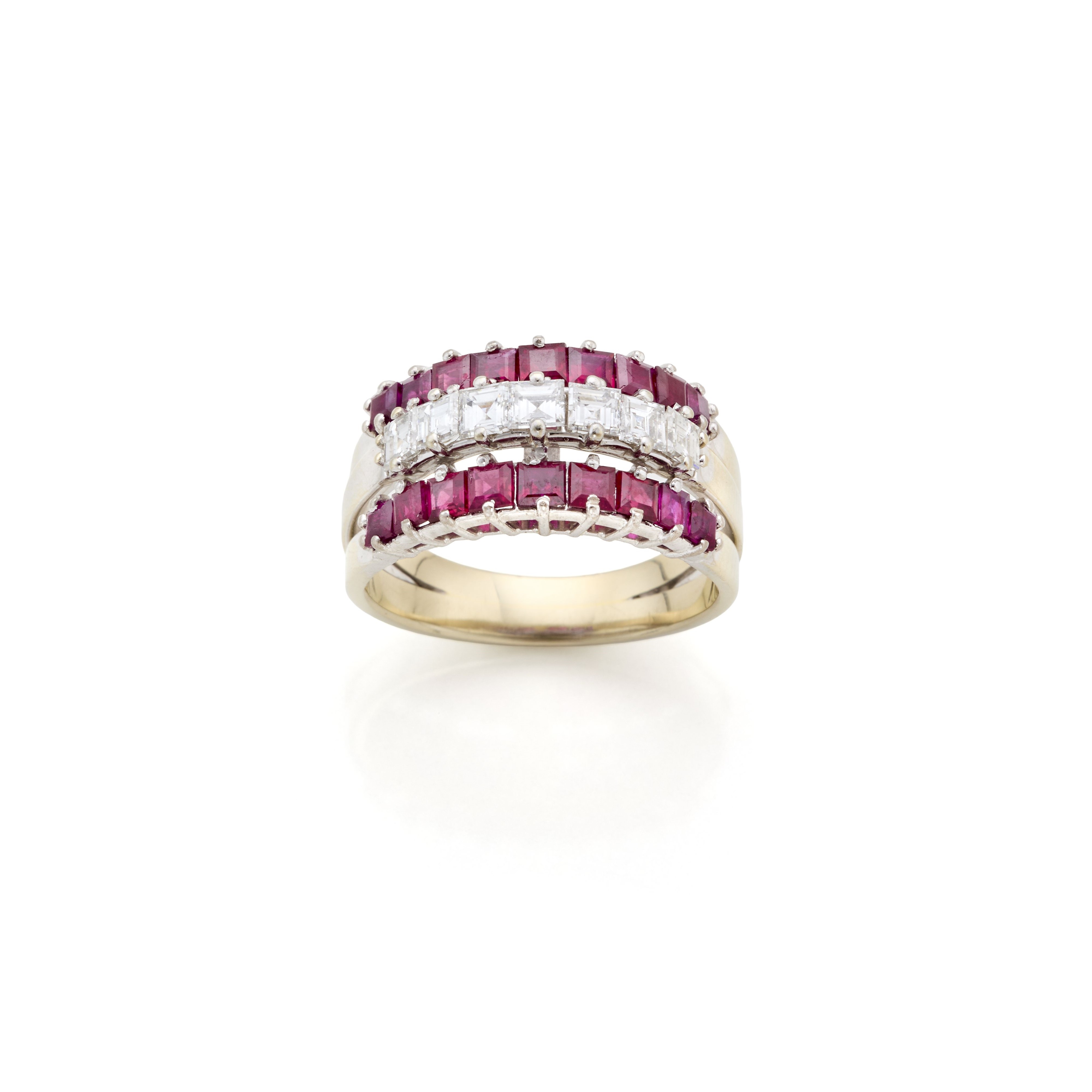 Anello Missiaglia in oro bianco 18 Kt con diamanti carrè per complessivi circa 0,75 ct e rubini carrè.