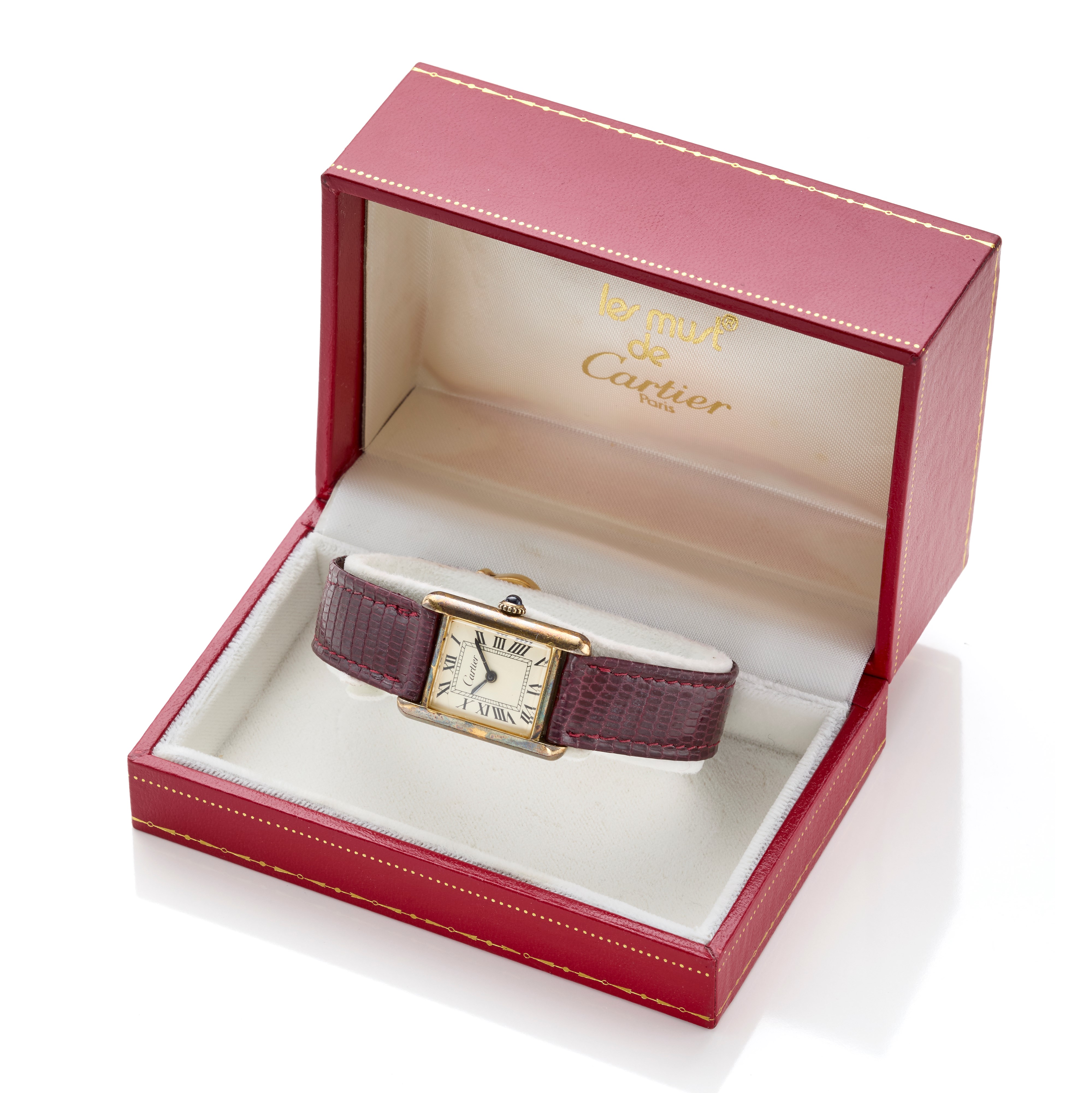 Cartier, wristwatch. Silver gold plated case with leather strap and gold plated buckle. Manual winding movement in need of servicing. With box and guarantee. Fair conditions.