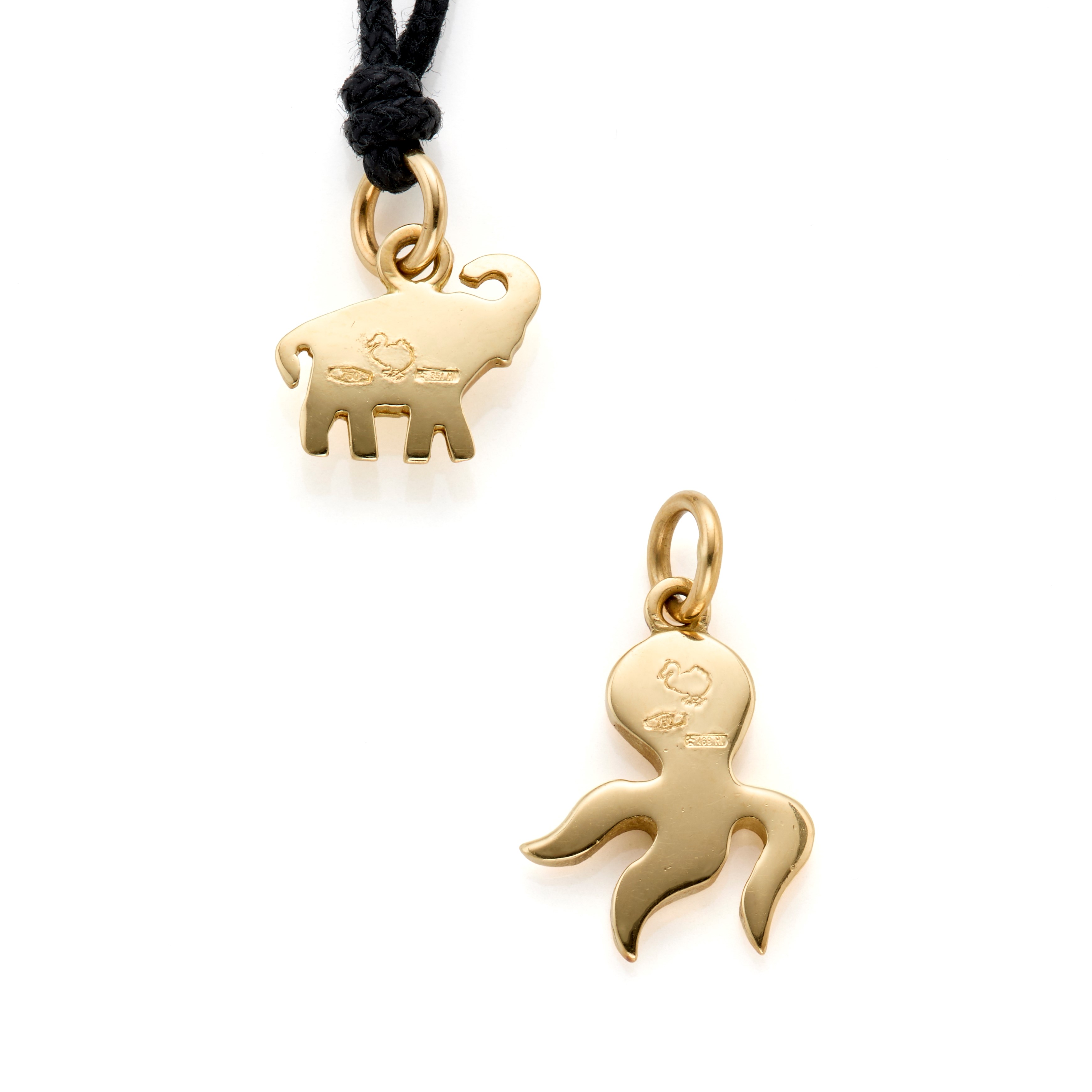 18 Kt yellow gold lot consisting of two Dodo pendants accompanied by a black cotton cord.