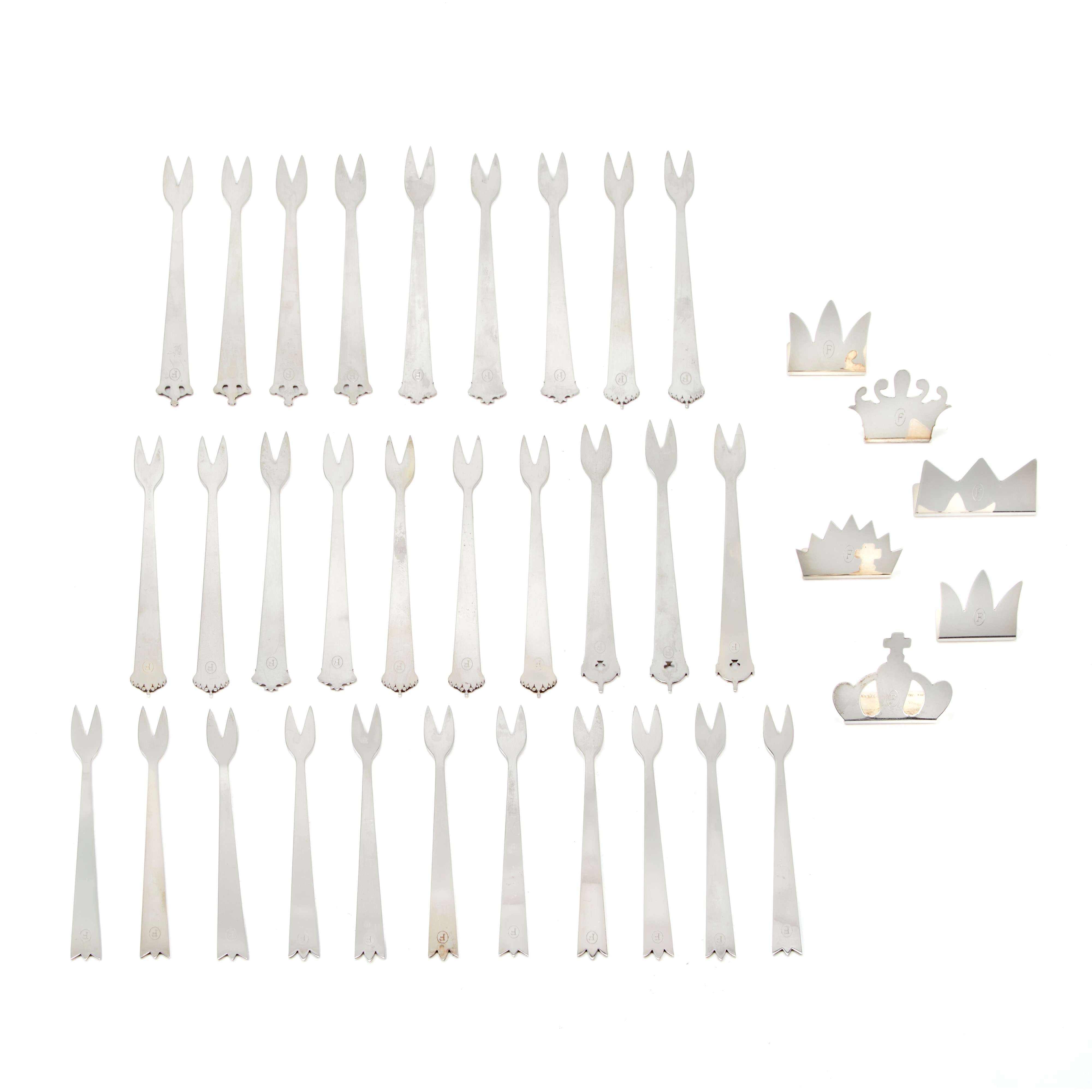 Faraone silver lot consisting of six place cards and thirty appetizer forks.