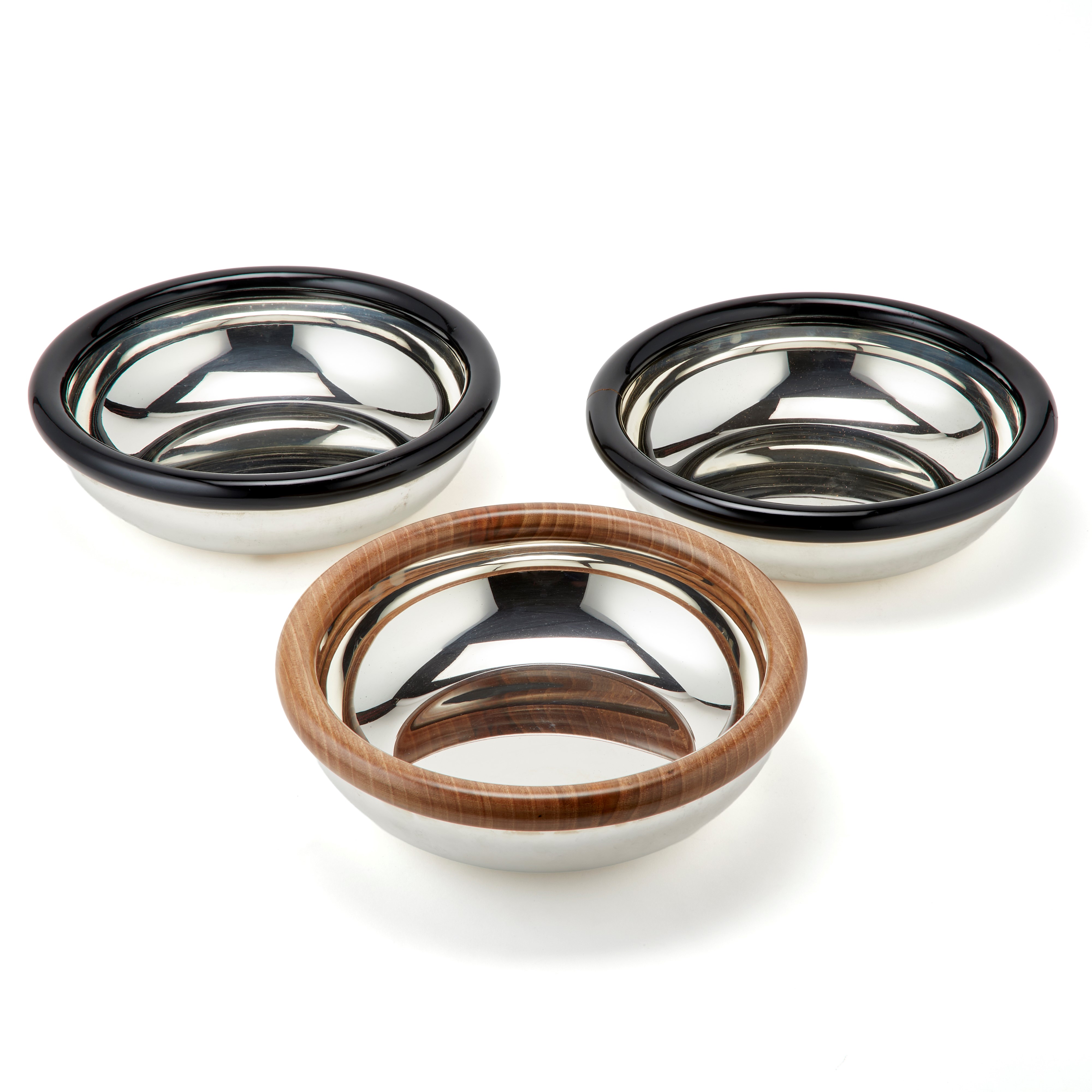 Three Faraone silver centerpieces with wooden edge.