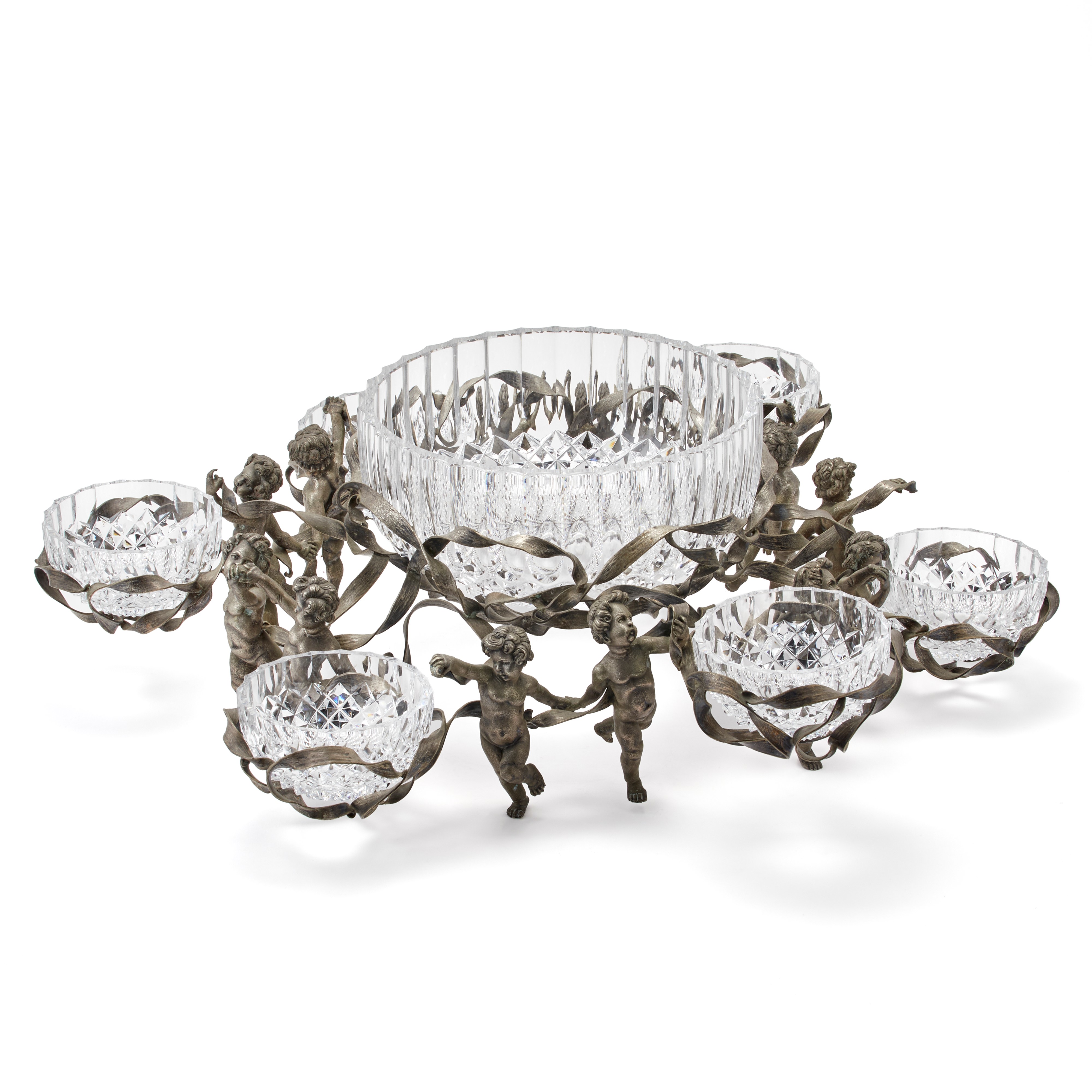 Silver centrepiece decorated with cherubs and seven crystal bowls.