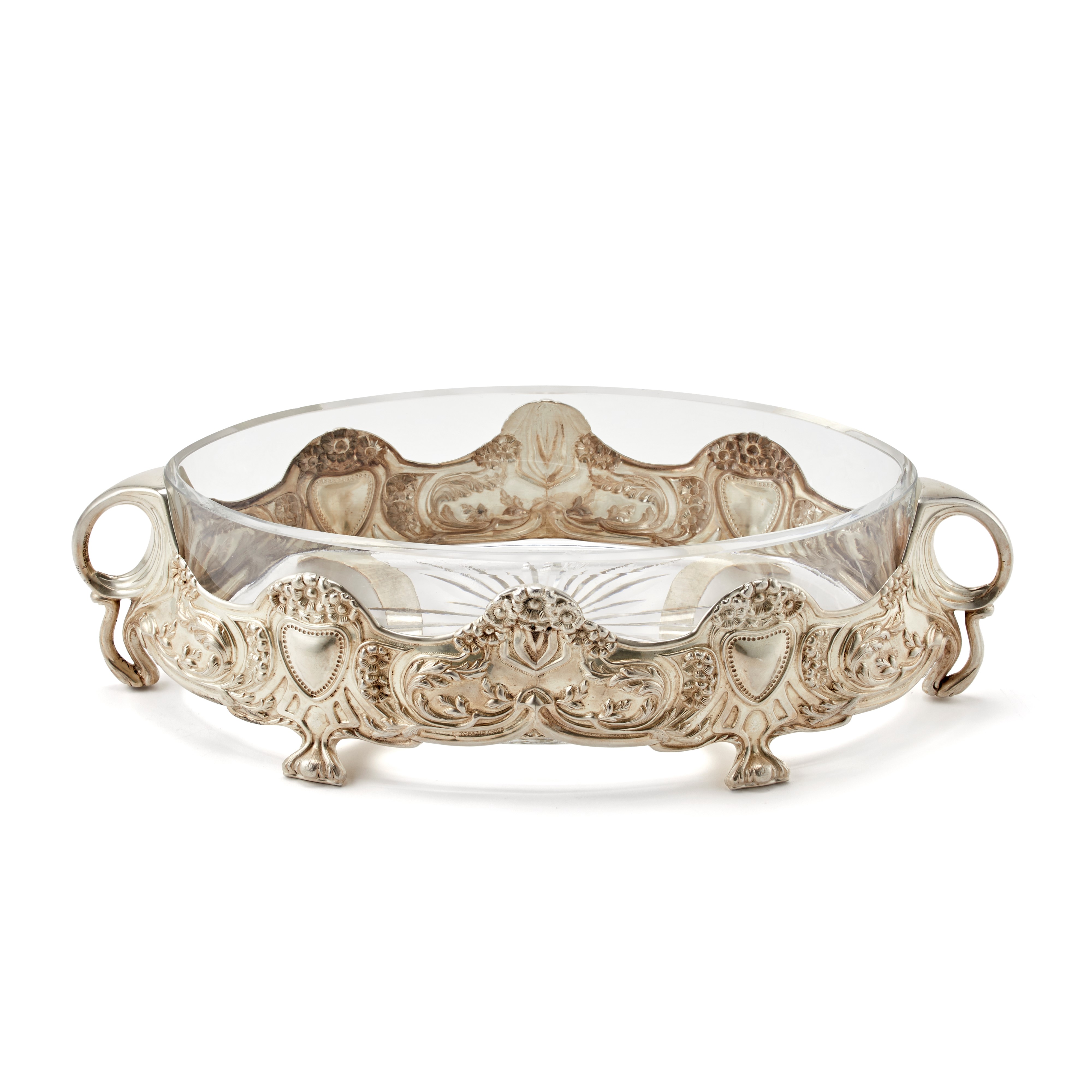 Centrotavola in argento biansato decorato da motivi floreali, vaschetta interna in vetro.