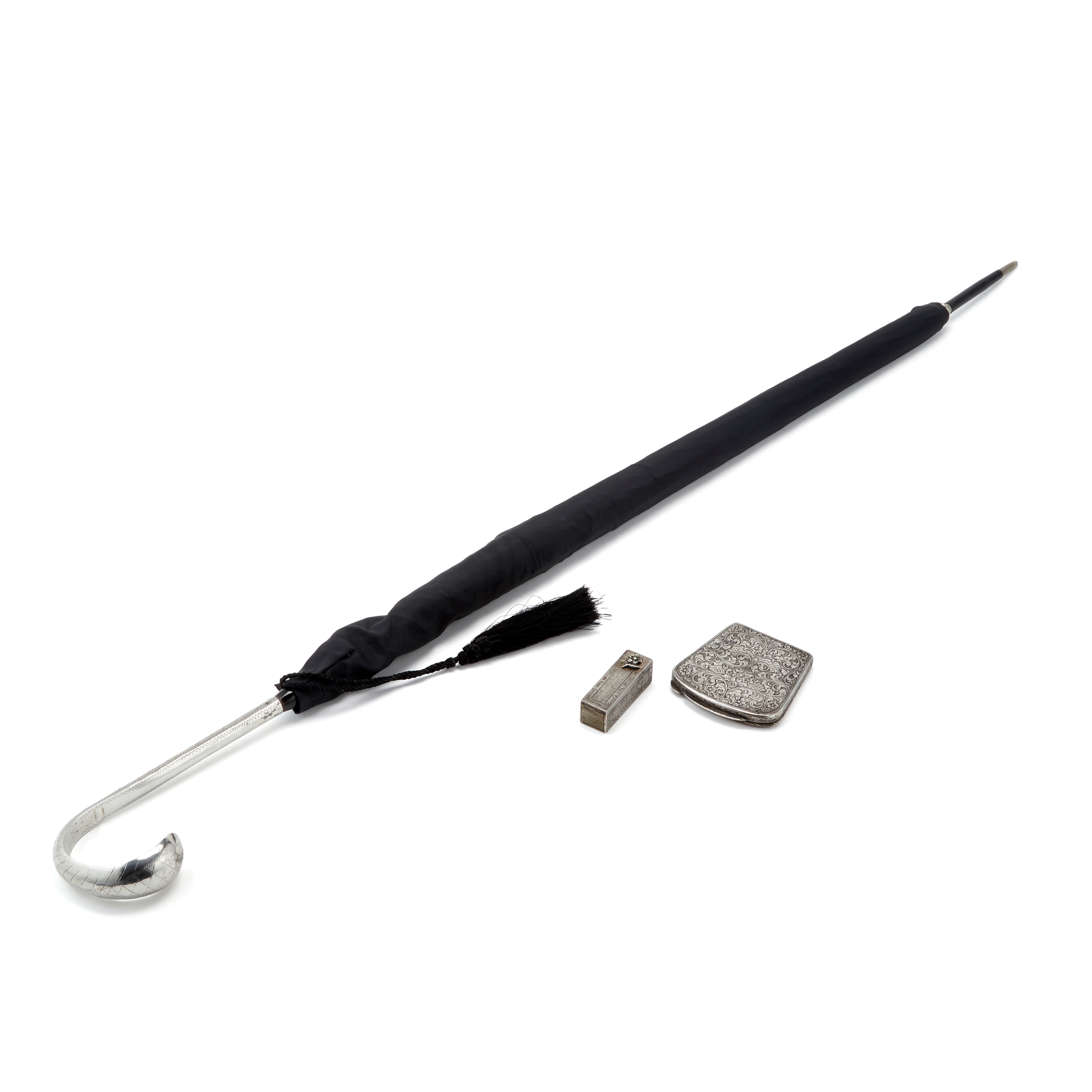 Silver lot consisting of a lipstick holder, a powder compact and a sunshade.