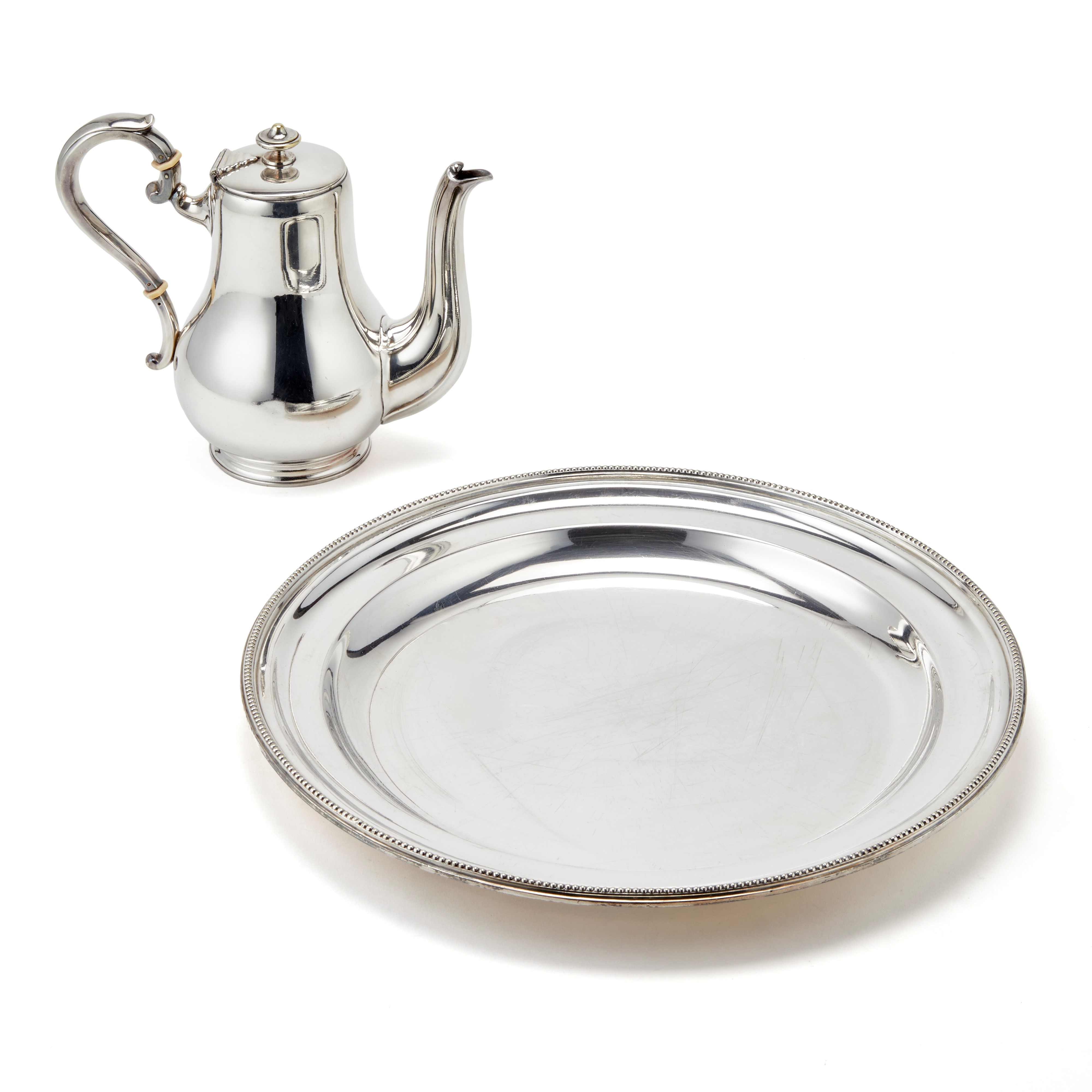 Lotto in metallo argentato composto da una caffettiera e un vassoio rotondo con bordo cordonato.