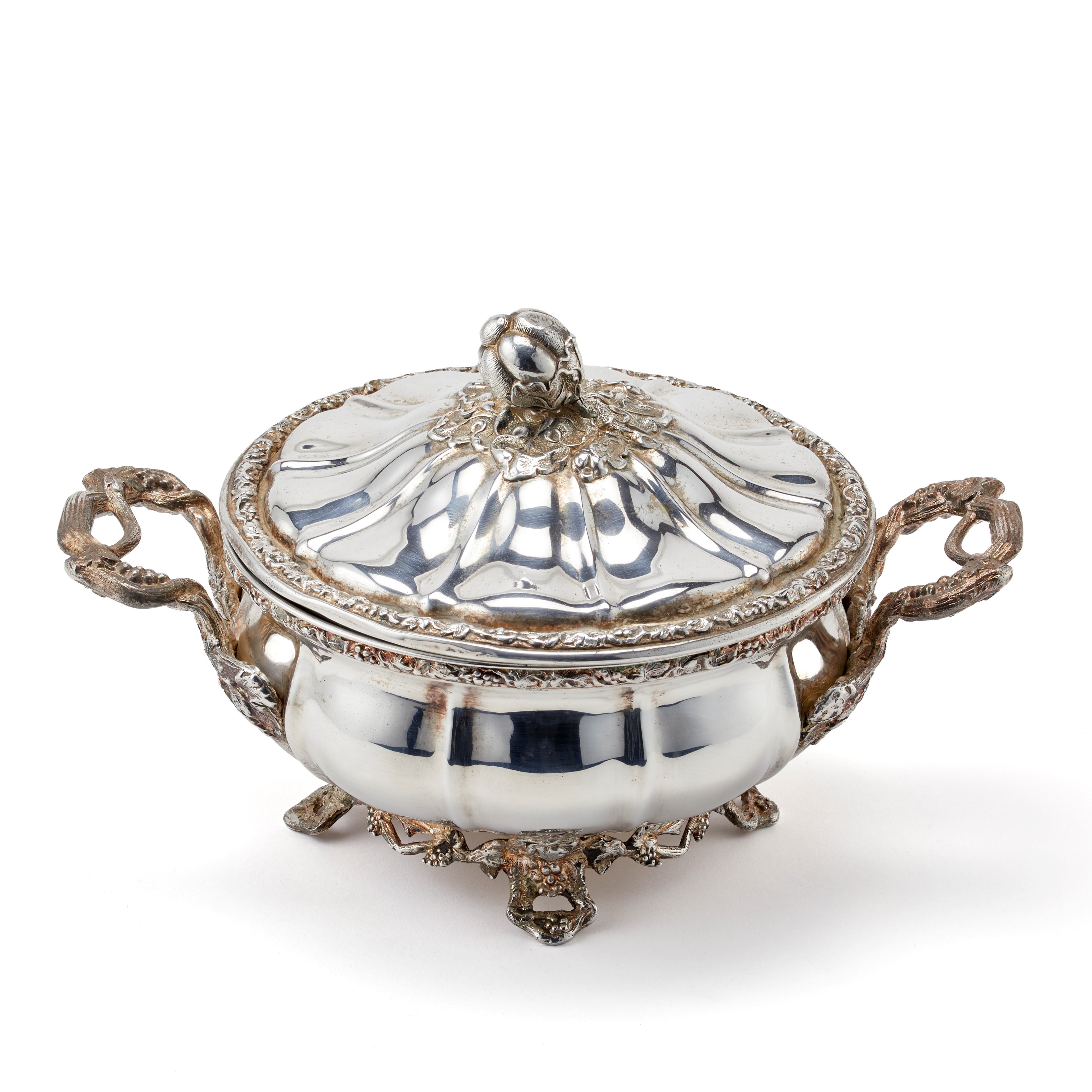 Zuppiera biansata con coperchio in metallo argentato decorata con motivi vegetali.