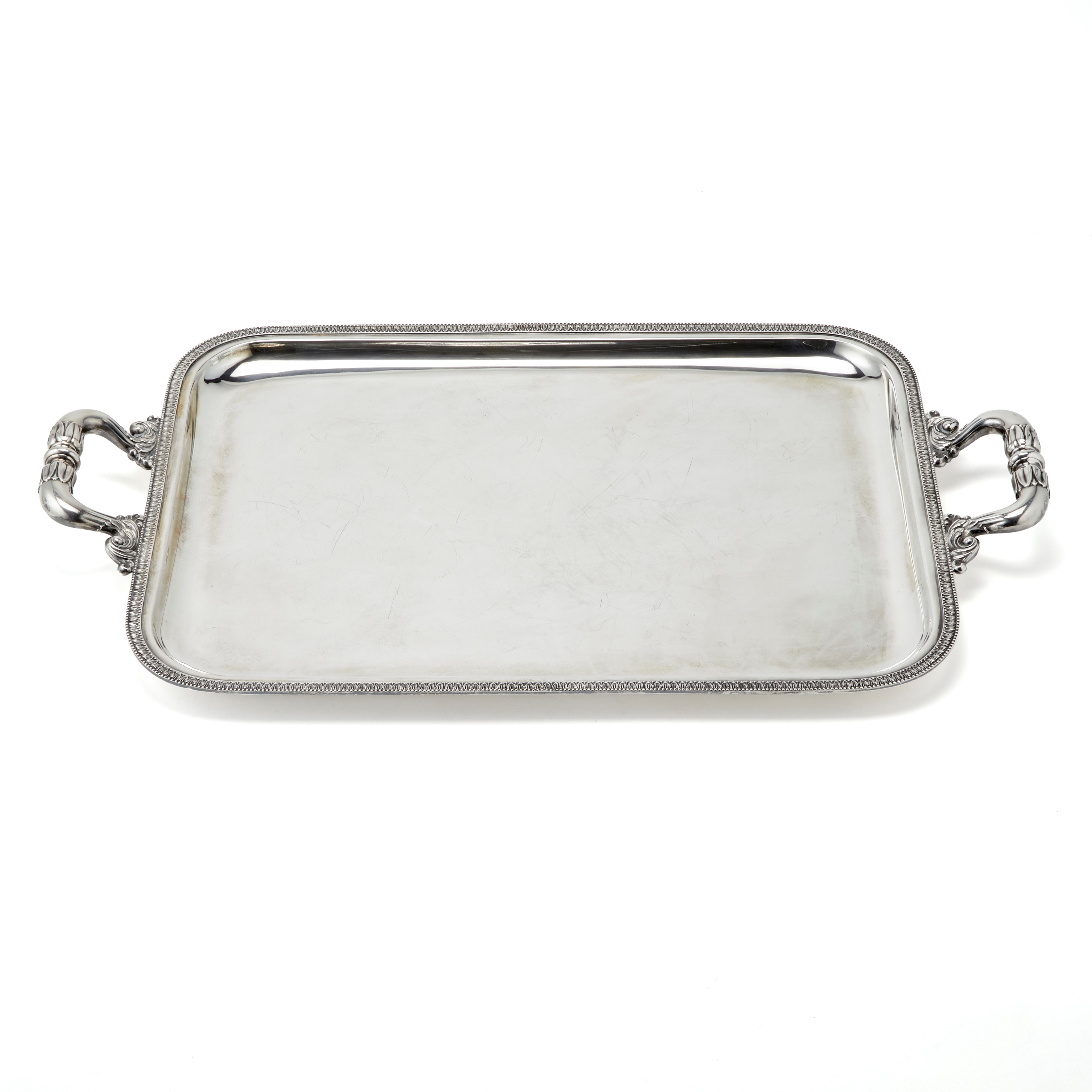 Vassoio rettangolare in argento biansato con bordo a foglie lanceolate.