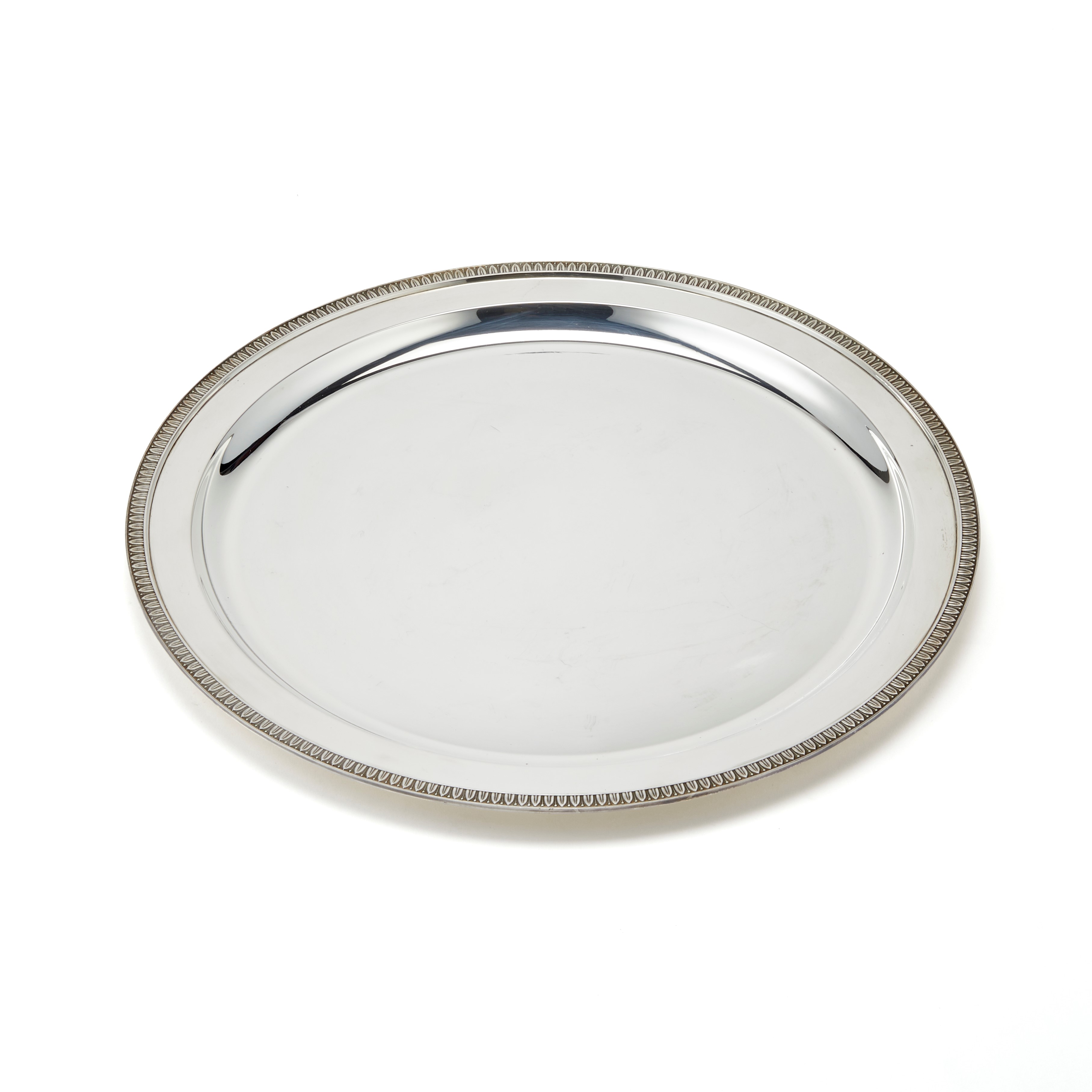 Vassoio rotondo in argento a corpo liscio con bordo a foglie lanceolate.
