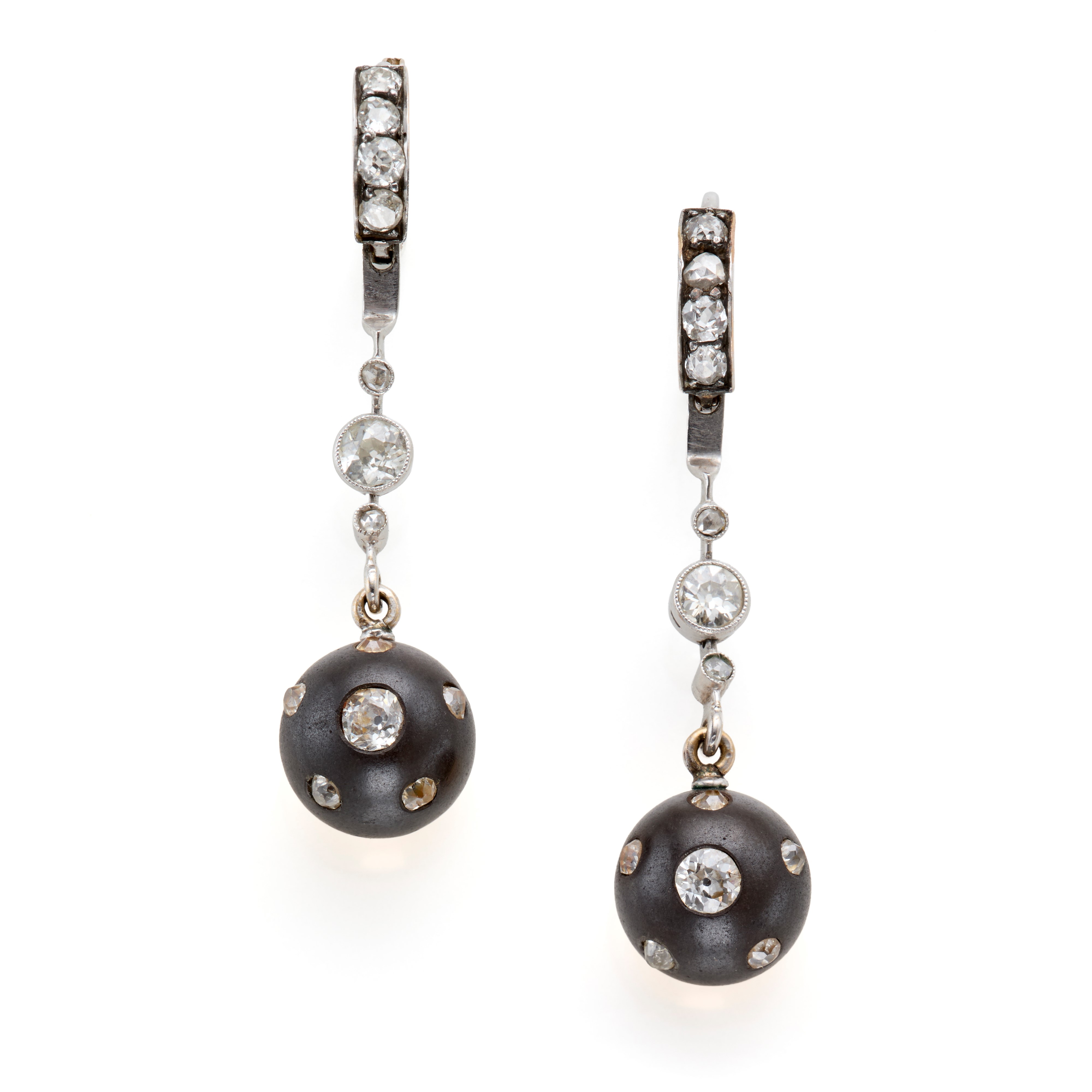 Orecchini pendenti in oro bianco 18 Kt con diamanti taglio vecchio per complessivi circa 0,90 ct, terminati con boules in oro e acciaio.