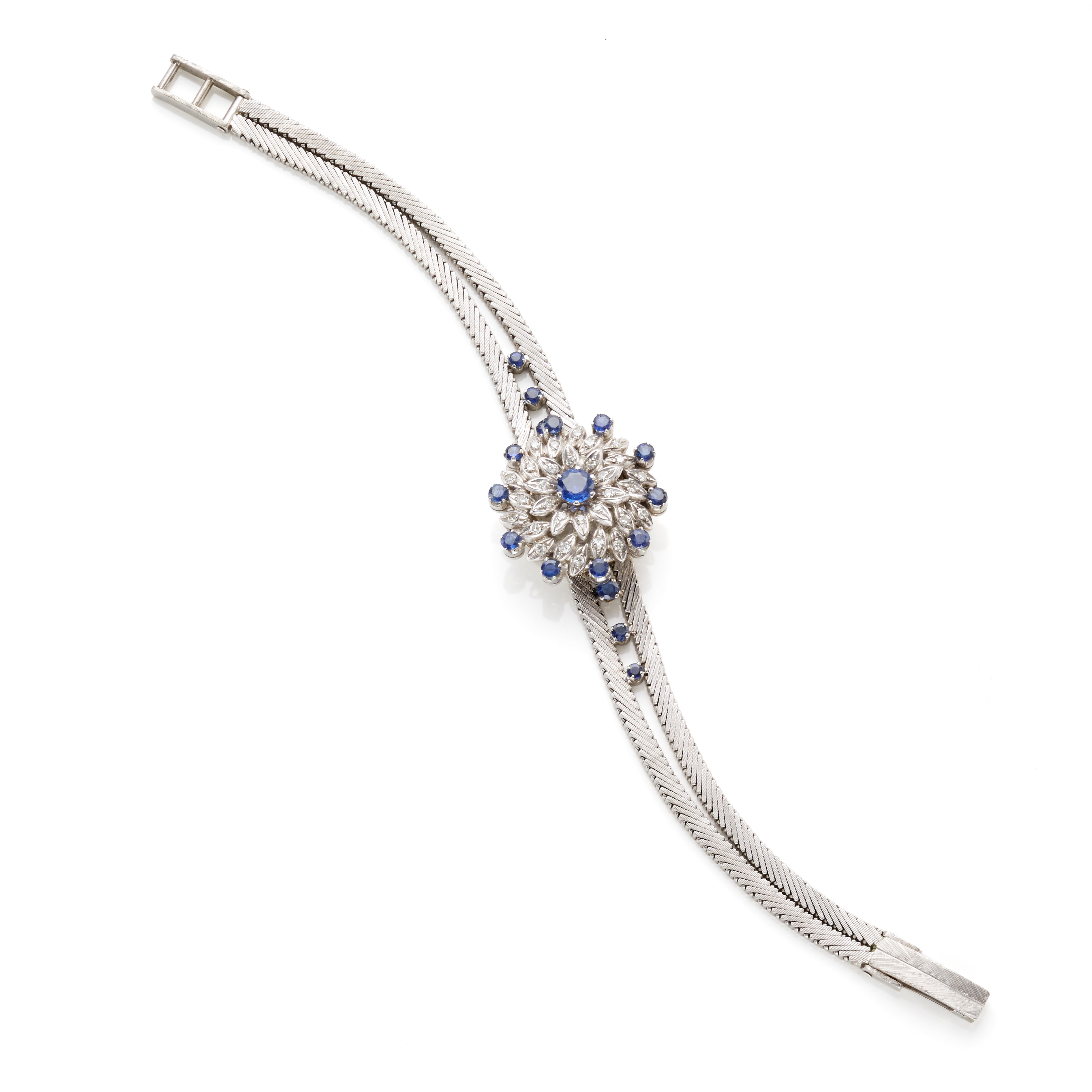 Jaeger-LeCoultre orologio gioiello in oro bianco 18 Kt rifinito con zaffiri rotondi per complessivi circa 1,10 ct e piccoli diamanti rotondi.